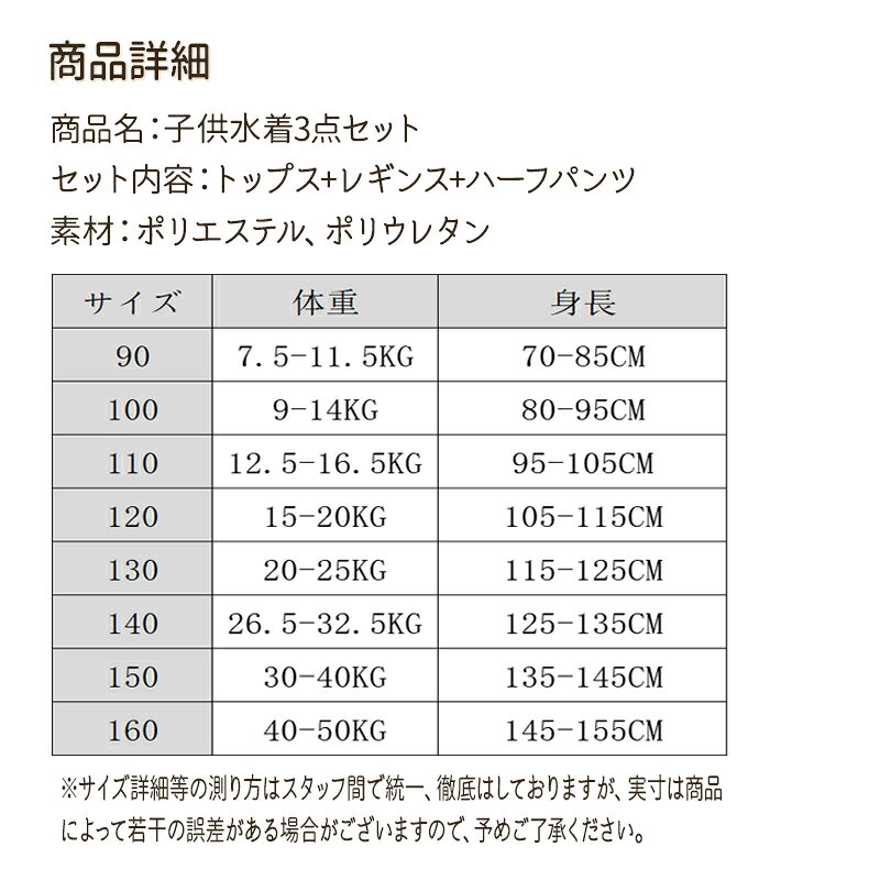 商品詳細 商品紹介 キッズ 水着 3点セット トップス+レギンス+ハーフパンツ ・紫外線からお肌を守る! お子様のデリケートな素肌を 日焼けからばっちりガード◎ HAPPYな上下セパレートタイプ☆ 素材 ポリエステル、ポリウレタン セット内容 トップス+レギンス+ハーフパンツ サイズ サイズ 体重 身長 90 7.5-11.5KG 70-85CM 100 9-14KG 80-95CM 110 12.5-16.5KG 95-105CM 120 15-20KG 105-115CM 130 20-25KG 115-125CM 140 26.5-32.5KG 125-135CM 150 30-40KG 135-145CM 160 40-50KG 145-155CM 注意事項 ◆PC環境・光の具合により、色や素材のイメージが写真と若干異なる場合がございます。 ◆モデル・写真に使用されているアクセサリー・小物は別途記載が無い限り付属いたしません。 ◆サイズ、カラーの交換は商品到着後7日以内にご連絡ください(※未使用・未洗濯)。