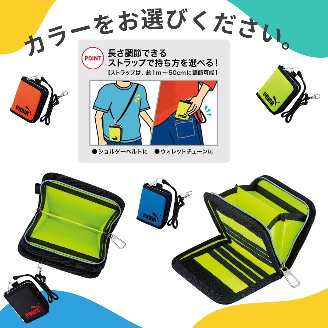 商品情報本体H125×W95×D25mm、90g材質ポリエステルクツワ PUMA 2つ折りウォレット(PM242) ウォレット 財布 通学 子供 キッズ 旅行 塾 お子様の通学やお出かけに便利 カラーをお選びください【2つ折りウォレット PM242】・小銭入が大きく開いて使いやすい ・札入1室、小銭入2室、カード入8室(6室+2室) ・長さを調節できるストラップ付で持ち方が選べる、約1m~50cmに調節可能 ・オリジナルデザインの引き手付 5