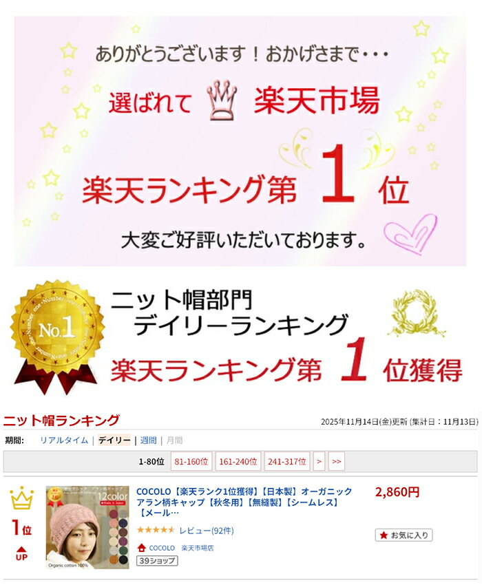 ★オーガニック アラン柄キャップ♪【秋冬用】【無縫製タイプ】 トレンドを少し意識したデザインと、やさしくて暖かな被り心地を両立した商品♪折り返しに小粋なアクセントとしてアラン柄を編み込んで上品で大人っぽく。 ふっくらシルエットで日常にぬくもりを添えるこだわりの帽子です。カラーバリエーションも豊富で男性にもオススメ♪無縫製タイプで柔らかいコットンの2重仕立て生地だから暖かさキープで肌ざわりも抜群♪お洒落を楽しめる商品です♪ 室内はもちろん外出用としてもオススメです。 抗がん剤治療が終わった後にもお洒落キャップとして使用出来ます! 【注意】草木染ではございませんので化学繊維敏感症や嗅覚の過敏な方には不向きな商品です。 <お取り扱い方法> 1.毛羽立ちや変形を防ぐため、ネットに入れて洗濯をお願いします。 2. 洗濯後、生地の性質上、多少縮むことがあります。 3. タンブル乾燥はお避け下さい。 4. 変形や生地の伸びを防ぐために引っ掛かり易いものがない場所に平干して下さい。 5.直射日光のあたる場所では、色あせすることがあります。影干しすることをおすすめします 【その他注意】 1.収縮性の良い商品のため洗濯時にはネットに入れて洗濯願います。 2.伸びやすい素材のため無理矢理引き伸ばすと変形いたします。取り扱いには十分ご注意願います。 3.商品写真は出来る限り現品を再現するように心がけていますが、ご利用のモニターにより差異が生じます。 あらかじめご了承願います。 ◆フリー:56.0〜59.5cm ◆スモール:53.0〜56.cm 上記サイズは当社規定の設定です。 素材:オーガニックコットン100% 日本製 ※当店取り扱いアイテム・人気検索キーワード: ランキング 1位 UV 紫外線 秋 冬 秋冬 防寒 ニット帽 ベレー帽 春新作 夏新作 冬新作 秋新作 リネン マリンキャップ 防水 ハット 撥水 帽子 レディース 大きいサイズ 大きめ 小顔 sサイズ 完全遮光 遮光100%カット UVカット 帽子屋 キャスケット キャップ CAP ハット UV 折りたたみ 自転車 飛ばない 日焼け たためる帽子 あご紐 つば広 春 春夏 夏 UV 紫外線 運動会 旅行 海 山 アウトドア 母の日 プレゼント 10代 20代 30代 40代 50代 60代 サイズ 52cm 53cm 54cm 55cm 56cm 57cm 58cm 59cm 60cm 61cm 62cm 63cm 64cm 人気 ランキング オシャレ かぶーる日傘 かぶる日傘 COCOLO ココロ 通販 帽子 ぼうし ニット帽 ニット帽子 ニットキャップ ワッチ ワッチキャップ ビーニー サマーニット帽 サマーニットキャップ ビッグワッチ 医療帽子 医療用帽子 術後 入院中 治療 抗癌剤 抗がん剤 ケア帽子 頭 手術 お見舞い 病院 患者 薄毛隠し 白髪隠し 円形脱毛症 保護 ナイトキャップ 就寝用帽子 おやすみ 室内帽子 肌に優しい 睡眠時 メンズ 男性用 お父さん 紳士 祖父 おじいちゃん スキンヘッド 老人ホーム 老人 坊主 レディース ミセス 女子 女性 女性用 婦人 ママ 祖母 お母さん おばあちゃん ユニセックス 男女兼用 大人 お年寄り 高齢者 シニア 10代 20代 30代 40代 50代 60代 70代 80代 90代 春 脱毛 白髪 隠し 薄毛 春用 春物 夏 サマー 夏用 夏物 真夏 春夏 春夏用 秋 秋用 冬 冬用 冬物 秋冬 秋冬用 オールシーズン 冷え予防 冷え対策 uv UVケア UV対策 UVカット 紫外線カット シンプル 無地 カジュアル 通気性 保湿性 速乾 おしゃれ お洒落 可愛い かわいい 大きいサイズ 大きめ ゆったり ビッグサイズ 薄手 薄い 薄め 無地 天然素材 綿100% コットン100% ウォッシャブル 洗える 手洗い洗濯可能 軽量 軽い 頭痛 シームレス 無縫製 ギフト プレゼント 誕生日 クリスマス バレンタイン ホワイトデー 母の日 父の日 敬老の日 外出 外出用 室内用 家 屋内用 アウトドア 紫外線対策 防寒 寒さ対策 通勤 人気 ファッション コーデスモールフリー 高さ(cm)約28.530.0 幅(cm)約20.021.5 適合サイズ(cm)約53.0~56.056.0~59.5 素材コットン100% 日本製 肌触り硬・・・・・●・柔 生地厚厚●・・・・・・薄 伸縮性無・・・・・・●有