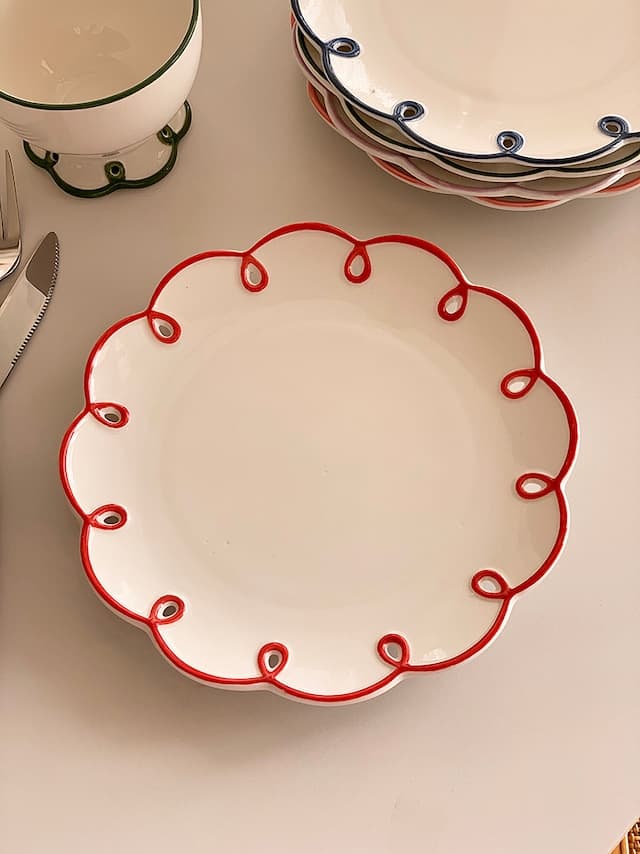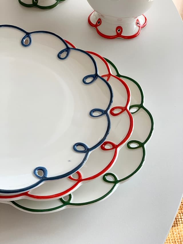 3colors/2type/バイカラーレトロラインプレート カップ お皿 お椀 レトロデザイン レッド ブルー グリーン フリル 花 韓国雑貨 韓国インテリア 食器 コップ 可愛い プレゼント セラミック