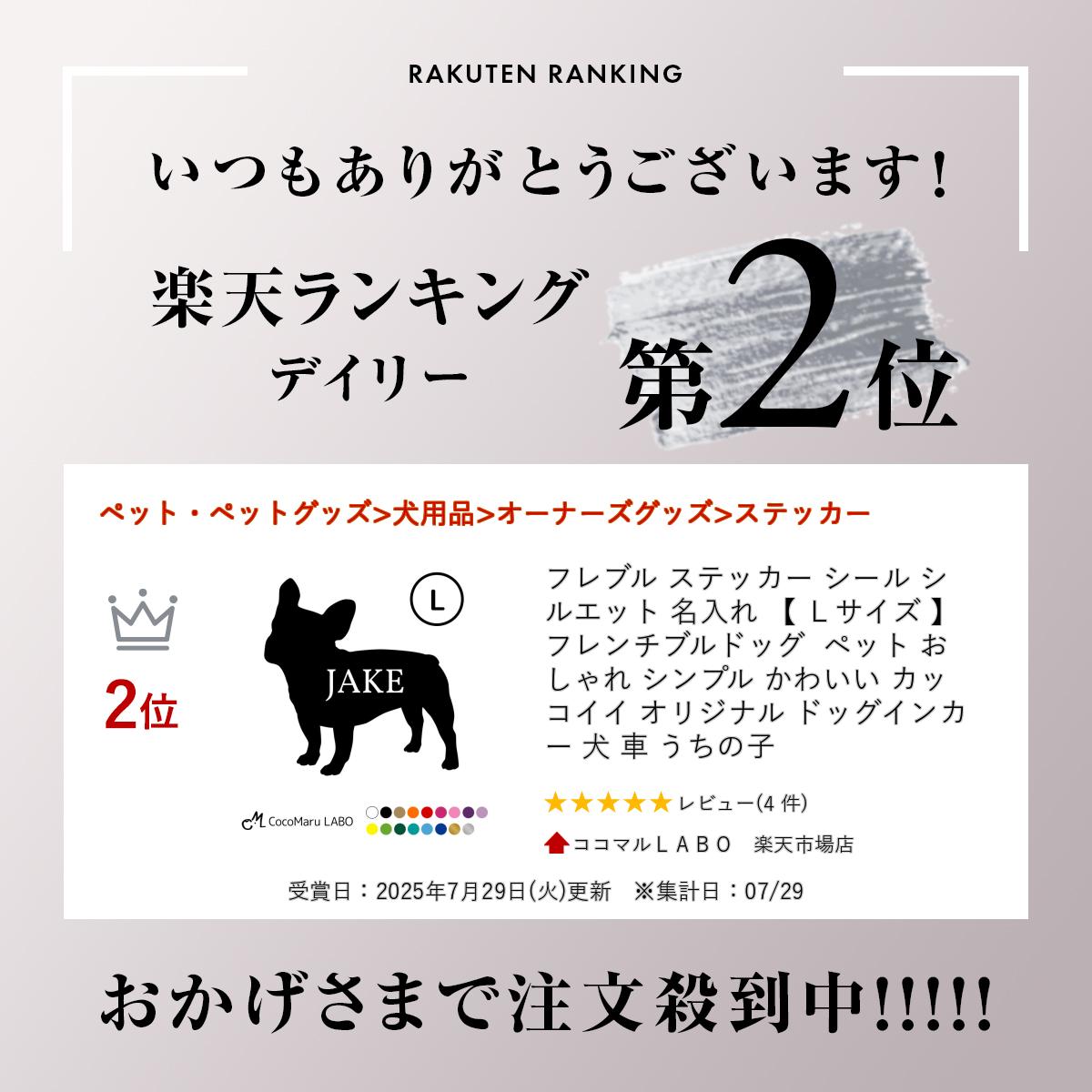 商品情報 内容 ・ステッカー 1枚・練習用 おまけステッカー・貼り方説明書タイプ 種類:フレンチブルドッグデザイン:シルエットその他:名入れ対応サイズ タテ132mm×ヨコ130mm材質・特徴 PVCフィルム(ポリ塩化ビニル)・デザイン部分だけが残るシール・色あせなし・防水・屋外耐候性5〜6年商品説明 1点1点デザインにこだわったココマルLABOオリジナル作品です。多頭飼いの方も必見!名前が入れられる、シンプルなフレンチブルドッグ シルエットステッカーです。ケージやフードボックスに貼れば簡単におしゃれなうちの子グッズへ早変わりです☆注意事項 ※ザラザラした所は剥がれやすかったり、貼れない場合があります※お客様のお使いのモニター発色の具合によって実際の商品と色合いが異なる場合がございます。キーワード うちの子シルエット フレンチブルドッグ フレブル 多頭 多頭飼い ステッカー ステッカー ペット 名入れ オーダー セミオーダー オリジナル おしゃれ オシャレ お洒落 シンプル かわいい 可愛い カッコイイ ドッグインカー 犬 シール 車 ドックインカー カーステッカー ドッグ カー ステッカー スマホ 犬 いぬ シール ペット 愛犬 dogincar car ペットステッカー 転写シール 転写ステッカー 表札 名前 シルエット うちの子 愛犬 簡単 プレゼント お祝い フードボックス おやつ入れ クレート ハウス ケージ ゲージ 大きめ 大きい L Lサイズ l lこの商品は フレブル シール ステッカー シルエット 【 Lサイズ 】 フレンチブルドッグ 名入れ ペット おしゃれ シンプル かわいい カッコイイ オリジナル ドッグインカー 犬 車 うちの子 ポイント 【フレブル】 ドックインカー カーステッカー ドッグカーステッカー いぬ ペット 愛犬 車 dogincar car ペットステッカー 転写シール 転写ステッカー かわいい!うちの子ステッカー★【Lサイズ】 当ページ【フレンチブルドッグ L 】のステッカーサイズは下記のとおりです。サイズ H132mm×W130mmうちの子がシルエットステッカーになって可愛くいろんなものをアレンジ♪シルエットとお名前のシンプルなステッカーなのでさり気なく、おしゃれにアピールできます。サイズ展開はS・M・Lの3種類!貼りたい場所に合わせてサイズが選べます☆【Sサイズはこちら】【Mサイズはこちら】★他の犬種・ネコちゃんはこちら★ ショップからのメッセージ 納期について 4
