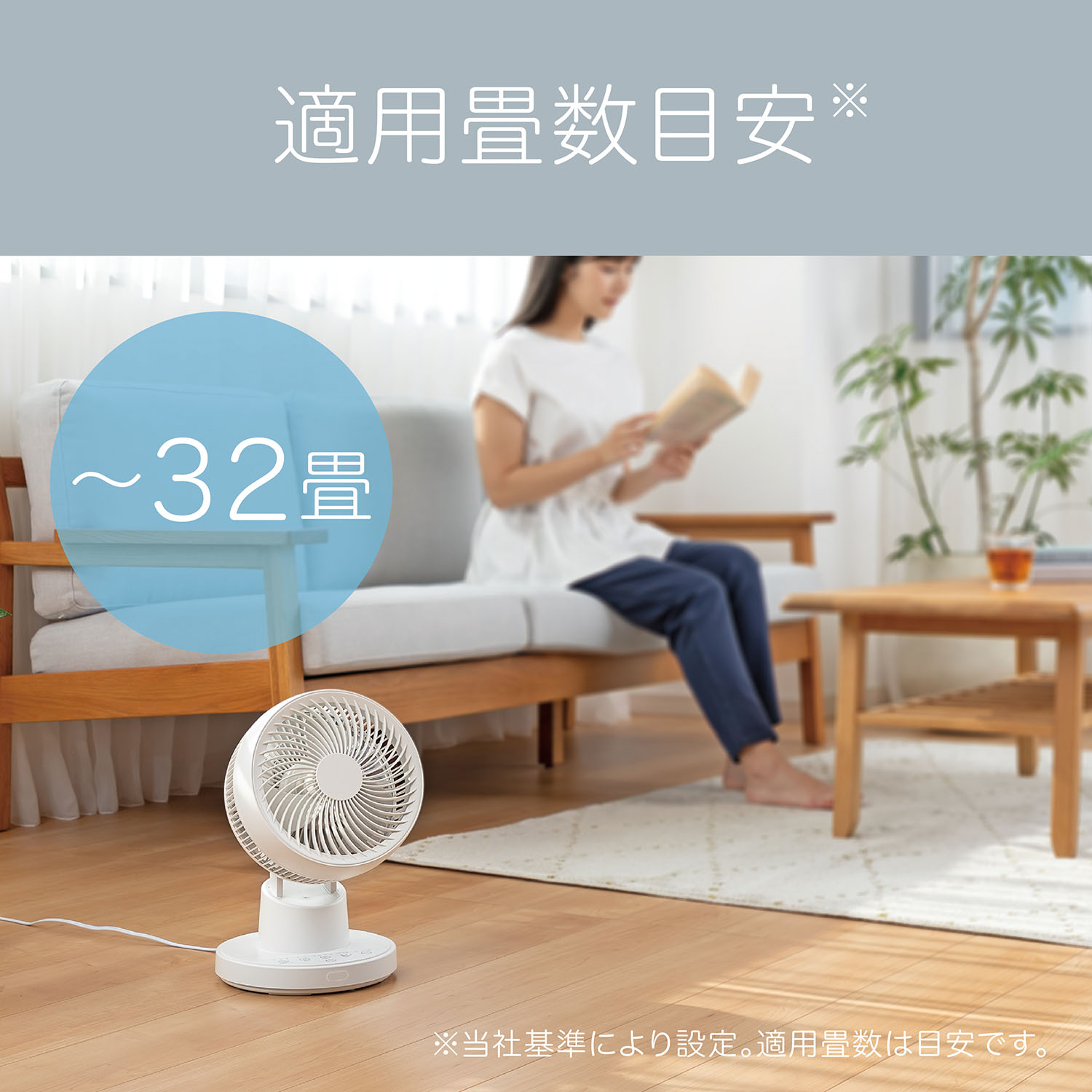 取り外せるフィルター付きで日々の手入れがとても簡単! ○ほこりをキャッチする取り外し可能なフィルター搭載 ○自動首振りの範囲を任意に設定可能「ピタッと首振り」機能搭載 ○上下首振り最大角度150度だから空気循環を効率よく ○DCモーター搭載、風量8段階 ○左右首振り60/90/120度、上下首振り0〜90/0〜150度 商品仕様 本体サイズ(幅)21 × (奥行)22 × (高さ)32cm 本体重量約1800g 電源AC100V 50/60Hz共用 消費電力34W モーターDCモーター 羽根径15 羽根枚数3枚 風量調節8段階 上下首振0°〜90°、0°〜150° 左右首振り60/90/120° 入タイマー1/2/4時間 切タイマー1/2/4時間 リモコン方式フルリモコン 設計の標準使用期間5年 コード長約1.8m 本体保証ご購入日から1年間わたし好みに合わせてくれる、かしこいサーキュレーター。 『適用畳数〜32畳』(目安)…しっかりパワフルな風を送ります。 『DCモータータイプ』…省エネ/静音/細かい風量調整で優れています。 ※適用畳数は当社基準により設定 部屋干しにも大活躍 首振り角度&風量を最適にあわせる衣類乾燥モードを搭載。「ピタッと首振り」で洗濯物をねらいうち。 「ピタッと首振り」特許出願中 自分好みの首振り範囲にピタッと設定。 2か所の折り返し位置(A点とB点)を記憶させて、お好みの首振り範囲を設定できます。 ※リモコン操作でのみ設定可能 夏の冷気循環/冬の暖気拡散に 上下、左右それぞれで「ピタッと首振り」設定ができるから、トルネード(竜巻)のような風を出せます。 人には直接風が当たらないようにできるのでストレスフリーに。 上下の自動首振り 水平から上向き90°・150°までの2段階で自動首振りが設定できます。 左右に自動首振り 左右に約60°・90°・120°の範囲に風を届けます。 8段階の風量調節 微風〜強風までお好みに合わせて調節が可能です。 便利なモードとタイマー おまかせモード 温度センサーが室温を感知。室温に応じて自動で風量をコントロールします。 ■室温28℃以上の暑いとき: 風量[6] 強めの風 ■25〜27℃の涼しいとき: 風量[3] 少し弱め ■24℃以下:送風を停止。 エアコンと併用することで1日の温度変化を快適に過ごせます。 衣類乾燥モード ボタンひとつで乾燥をサポート。洗濯物に風が届きやすいような角度や風量があらかじめ設定されています。 左右の首振り角度(洗濯物の量)によって風量3パターンを設定できます。 切タイマー おやすみ時も安心、設定した時間に自動的に電源オフ。消し忘れ防止&ムダな電気代をカットします。 1/2/4時間後に設定できます。 入タイマー お目覚めも快適、設定した時間に自動的に電源オン。1/2/4時間後に設定できます。 操作部 タッチ式でシンプルな操作部。LEDで分かりやすい表示。 リモコン付き 離れた場所からでも操作ができます。 リモコン収納 使わないときは台座に収納可能。 お手入れらくらく 工具なしで完全分解 工具不要で後ガードまで完全分解ができ、ガード・羽根・フィルターは水洗いができます。 簡単にはずせるフィルター 本体の背面にあるツマミを引っ張るだけで取り外せます。 さっと掃除 普段はフィルターを掃除機等で吸い取るだけでかんたんお掃除。本格的なお掃除は分解してシーズンごとに清潔に。 サーキュレーターで省エネ エアコンと併用して効率的に節電。 サイズ