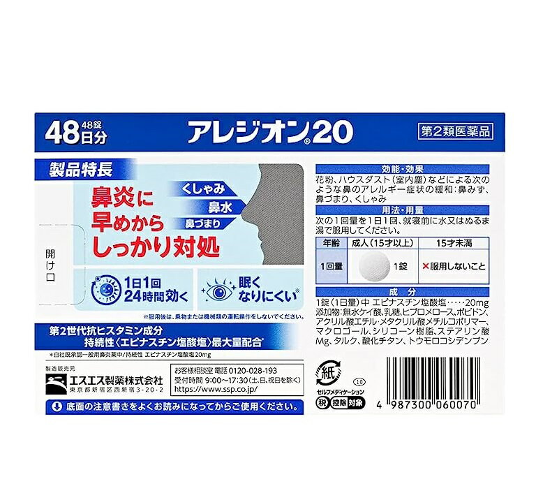 商品名 アレジオン20 内容量 48錠 商品説明 ・アレジオン20は、第2世代抗ヒスタミン成分のエピナスチン塩酸塩を1錠当たり20mg含有。 くしゃみ・鼻汁症状にすぐれた効果を発揮します。 第2世代抗ヒスタミン成分なので、眠くなりにくいアレルギー性鼻炎内服薬です。 ・花粉やハウスダストによる鼻炎症状は、それらを吸い込んだ時に ヒスタミンやロイコトリエンといった原因物質が体内で放出されることで起こります。 エピナスチン塩酸塩は、原因物質の作用を阻害するとともに、 放出自体を抑えることでアレルギーによる鼻炎症状にすぐれた効果を発揮します。 ・1日1回就寝前の服用で効きます。 なお、花粉などの季節性のアレルギー性鼻炎症状に使用する場合は、症状が出始めたら 早めに服用すると効果的です。 効能・効果花粉、ハウスダスト(室内塵)などによる次のような鼻のアレルギー症状の緩和:鼻みず、鼻づまり、くしゃみ用法・用量次の1回量を1日1回、就寝前に水又はぬるま湯で服用してください。 15才以上:1回1錠 15才未満:服用しない事 (1)用法・用量を厳守してください。 (2)花粉など季節性のアレルギー性鼻炎による症状に使用する場合は、花粉飛散期に入って症状が出始めたら、 症状の軽い早めの時期からの服用が効果的です。 (3)錠剤の取り出し方 錠剤の入っているPTPシートの凸部を指先で強く押して裏面のアルミ箔を破り、取り出してお飲みください。 (誤ってそのまま飲み込んだりすると食道粘膜に突き刺さるなど思わぬ事故につながります。)成分・分量 1錠(1日量)中 成分・・・分量 エピナスチン塩酸塩・・・20mg 添加物:無水ケイ酸、乳糖、ヒプロメロース、ポビドン、アクリル酸エチル・メタクリル酸メチルコポリマー、マクロゴール、シリコーン樹脂、ステアリン酸Mg、タルク、酸化チタン、トウモロコシデンプン 使用上の注意1.次の人は服用前に医師、薬剤師又は登録販売者に相談してください (1)医師の治療を受けている人。 (2)妊婦又は妊娠していると思われる人。 (3)高齢者。 (4)薬などによりアレルギー症状を起こしたことがある人。 (5)アレルギーによる症状か他の原因による症状かはっきりしない人。 (6)気管支ぜんそく、アトピー性皮膚炎等の他のアレルギー疾患の診断を受けたことがある人。 (7)エピナスチン塩酸塩を10mg含有する医薬品から本剤に変更しようとしている人。 2.服用後、次の症状があらわれた場合は副作用の可能性があるので、直ちに服用を中止し、この説明書を持って医師、薬剤師又は登録販売者に相談してください 【関係部位:症状】 皮膚:発疹・発赤、はれ、かゆみ 消化器:吐き気・嘔吐、口内炎、胃部不快感、腹痛、胃重感、胃もたれ感、腹部膨満感、食欲不振 精神神経系:めまい、不眠、頭痛、頭がボーッとする、しびれ感、悪夢、幻覚、幻聴 呼吸器:息苦しい 循環器:動悸 泌尿器:排尿困難、頻尿、血尿、蛋白尿 その他:むくみ、ほてり、胸痛、痰がからむ、倦怠感、鼻づまり、月経異常、苦味を感じる、味覚が弱くなる、女性化乳房(男性に見られる女性のような乳房)、乳房が大きくなる まれに下記の重篤な症状が起こることがあります。その場合は直ちに医師の診療を受けてください。 【症状の名称:症状】 肝機能障害:発熱、かゆみ、発疹、黄疸(皮膚や白目が黄色くなる)、褐色尿、全身のだるさ、食欲不振等があらわれる。 血小板減少:血液中の成分である血小板の数が減ることにより、鼻血、歯ぐきからの出血、青あざ等の出血症状があらわれる。 3.服用後、次の症状があらわれることがあるので、このような症状の持続又は増強が見られた場合には、服用を中止し、この説明書を持って医師、薬剤師又は登録販売者に相談してください 口のかわき、便秘、下痢、眠気 4.1週間位服用(他のエピナスチン塩酸塩を含有する医薬品の服用期間を含む)しても症状がよくならない場合は服用を中止し、この説明書を持って医師、薬剤師又は登録販売者に相談してください 5.症状の改善が見られても2週間(他のエピナスチン塩酸塩を含有する医薬品の服用期間を含む)を超えて服用する場合は、医師、薬剤師又は登録販売者に相談してください 保管及び取扱の注意 1.直射日光の当たらない湿気の少ない涼しい所に保管してください。 2.小児の手の届かない所に保管してください。 3.他の容器に入れ替えないでください。(誤用の原因になったり品質が変わることがあります。) 4.使用期限をすぎたものは服用しないでください。 製造販売元エスエス製薬株式会社 お客様相談室 0120-028-193 受付時間 平日9:00 〜 16:30 区分 第2類医薬品 原産国 日本 広告文責 株式会社ライズコーポレーションTEL:03-5542-1285 リスク区分 リスク区分 第2類医薬品 医薬品の使用期限 使用期限 使用期限まで1年以上あるものをお送りします。 「医薬品販売に関する記載事項」(必須記載事項)はこちら