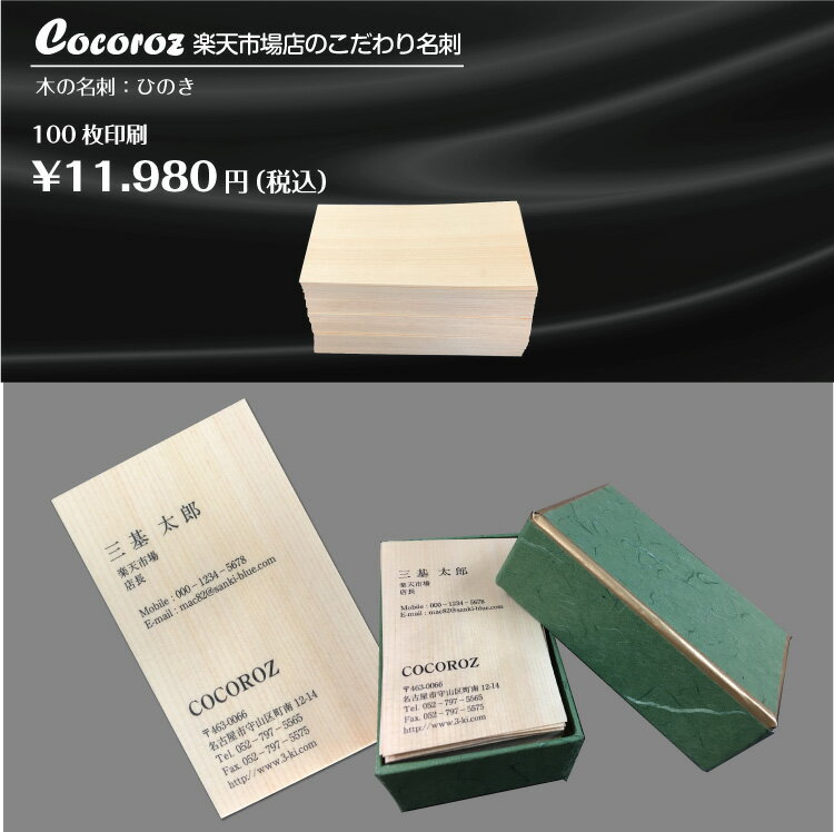 サイズ 91mm×55mm 用紙 木の名刺『ひのき』 枚数 50枚 送料 メール便送料無料 (宅配便指定の場合、別途送料必要) 梱包ケース 紙製エコケース (D)114mm×(W)94mm×(H)16mm(オプションでPPケースに変更可能) 納期 校正確認後、2日営業日以内の発送。 大型連休明け、繁忙時期により納期が遅れる場合もございます。予めご了承願います。 印刷前校正確認 校正確認・修正は何度でも無料で対応致します。 お客様にご納得いただけるまで行いますのでお気軽にお申し付け下さい。 ※注意 1.校正(修正)は文字のみが対象となります。 大幅なレイアウト修正(文字の配置位置変更)につきましては承けたまわれません。ご了承お願い致します。 2.お客様がご使用の端末機のディスプレイで表示した色味と、実際にプリンターで印刷した色味に多少の差異が生じる場合がございます。予めご了承お願い致します。 こだわり品質 お送りした印刷物に満足して頂けなかった場合、商品到着より5日以内にご連絡下さい。 刷り直し・返金処理・交換の対応をさせていただきます。 ※尚、お客様ご都合の場合は対応致しかねる場合もございます。ご理解の程、宜しくお願い致します。 ご不明点はお気軽にお問い合わせ下さい。名刺デザインは下記よりお選び下さい 名刺印刷オプション オプション追加で名刺をグレードアップしてみませんか! ご希望のオプションをクリックしていただくと、商品ページ又はカテゴリーページへ移行します。 原稿入力方法 商品購入時、ご注文フォームに名刺に記載するお客様情報をご記入下さい。 不要箇所は空欄で結構です。 当店にて原稿に合わせたレイアウト調整を行います。 システム上の文字数制限で書ききれない項目がある場合は、注文確認ページ「備考欄」をご利用下さい。