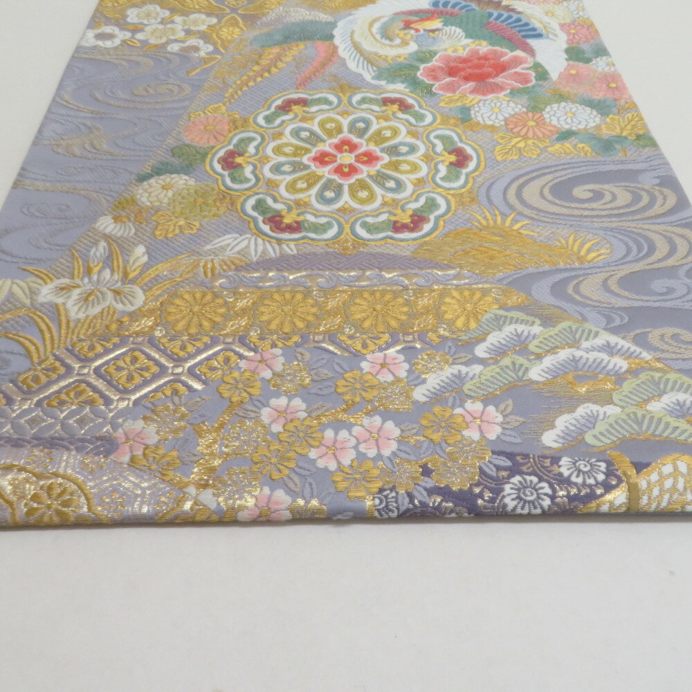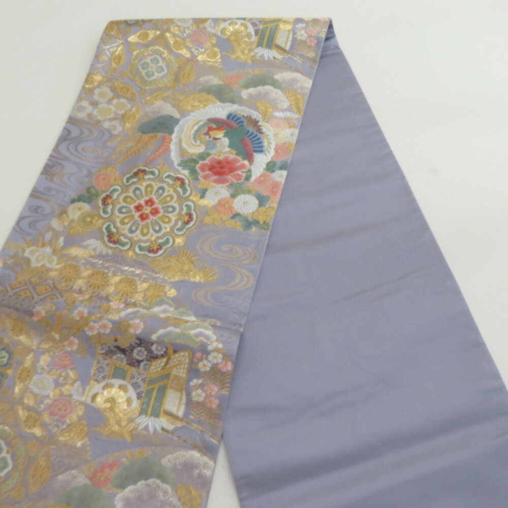 袋帯 華文に尾長鳥紋様 薄紫x金色x多色 金糸 六通柄 正絹 仕立て上がり 着物帯 長さ448cm【中古】