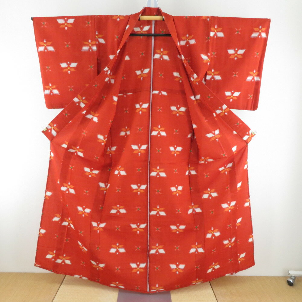 ウール着物 単衣 茶色x黄色 蝶々模様 バチ衿 カジュアルきもの 普段着物 仕立て上がり 身丈156cm【中古】