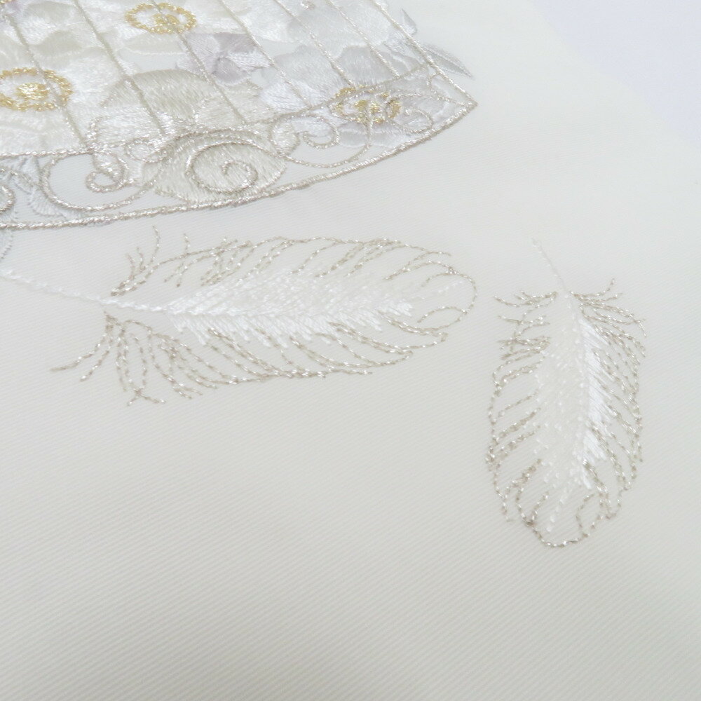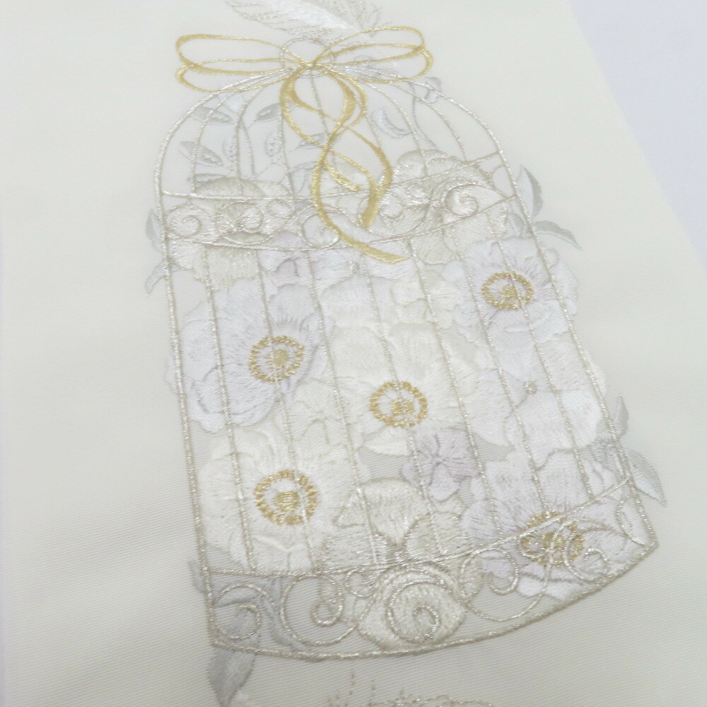 刺繍半衿・重ね衿セット オフホワイト 花×鳥かご×羽根 Silelly シルエリー ブラック×ゴールド リバーシブル 新合繊 ポリエステル 半襟 伊達衿 モノトーン 振袖 礼装 成人式 卒業式 和装小物 日本製 新品