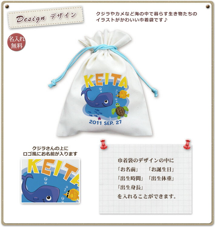 >>> メール便についての詳しい説明はこちら <<<幻想的な水中の世界♪「海の中のいきもの」デザインの巾着袋です。クジラや海亀、クマノミなど、海の中で暮らす生き物たちが楽しそうに泳ぐイラストがかわいい、海と動物が大好きな男の子への出産祝いにぴったりな巾着袋です。お子様のお名前は上部にポップなデザインで入り、楽しい魚たちのイラストはお子様の興味もそそります。名入れは「お名前」と「お誕生日」の他、「出生時間」や「出生体重」も入れることができるコップ袋です。(もちろん、お名前のみでも制作可能です。)サイズは高さ24cm幅18cmしぼり位置までの高さは18cmでお子様向けの歯ブラシも入りますので通園用・通学用のコップ入れや小物入れにぴったりです♪★お子様のお名前とデザインが合体★ココロコではデザイナーが文字のバランスを調整して絵柄の中にお名前やお誕生日の文字を入れて一点ずつ専用のデザインを作成しています。ですから仕上がりも奇麗に、まるで自分のブランドのようなオリジナルアイテムを作ることができるんです!セミオーダーメイドで作る一点ものの名入れグッズは★世界でたった一つだけの贈り物★二人目三人目の出産祝いでも他とかぶらないお祝いとして喜ばれています。■ Item SpecサイズW18×H24cmしぼり位置までの高さ18cm※サイズのWは横幅、Hは高さです素材生地:綿100%紐:アクリル重さ約24gプリント前イメージ確認について(有料300円)プリント前イメージの確認を希望の方は備考欄へ「イメージ確認希望(+300円)」の旨ご記入下さい。納期にプラス約3営業日いただき、メールにてデザイン画像をお知らせします。もしここで名入れ情報の変更がある場合は2回まで無料で修正が可能です。■ご注意 イメージ確認をご希望の場合「画像を確認し、制作OKのお返事」を頂くまで実物の商品制作はいたしません。当店からのメールは必ずご確認ください。綿100% 名入れきんちゃくぶくろ 名入れコップ袋 名入れコップ入れ 名入れ歯ブラシ入れ ミニ巾着 ミニきんちゃく 小物入れ クジラ くじら 鯨 カクレクマノミ 海がめ ウミガメ 海ガメ かめ 亀 カメ 深海 海中 水中 海の底 魚群 回遊魚 ひとで ヒトデ 海星 絵↑通園・通学のコップ入れに♪お子様向け歯ブラシも入る名前入り巾着(きんちゃく・コップ袋)の全商品はこちら!↑■ココロコの名前入りキッズTシャツ、ロンパース、ビブ・スタイ(よだれかけ)、トートバッグ、ランチバッグ、レッスンバッグ、リュック、おくるみは、高品質のダイレクトインクジェットプリントで作られています。ダイレクトインクジェットプリントとは、従来の転写プリントとは違って、顔料インクで直接生地を染めておりますので、プリント部分がはがれてしまったり、ひび割れが生じたりすることがありません。また、繊維が本来もつ通気性・吸水性を損なわず、お子様の体にも優しいソフトな風合いの仕上がりとなっております。ぞうさん TシャツI LOVE MOM 今治ビブアニマルクロック ランチバッグきりん リュックでんしゃ バスタオルちょうちょ バスタオルツリークロック バスタオルアニマルワールド バスタオル