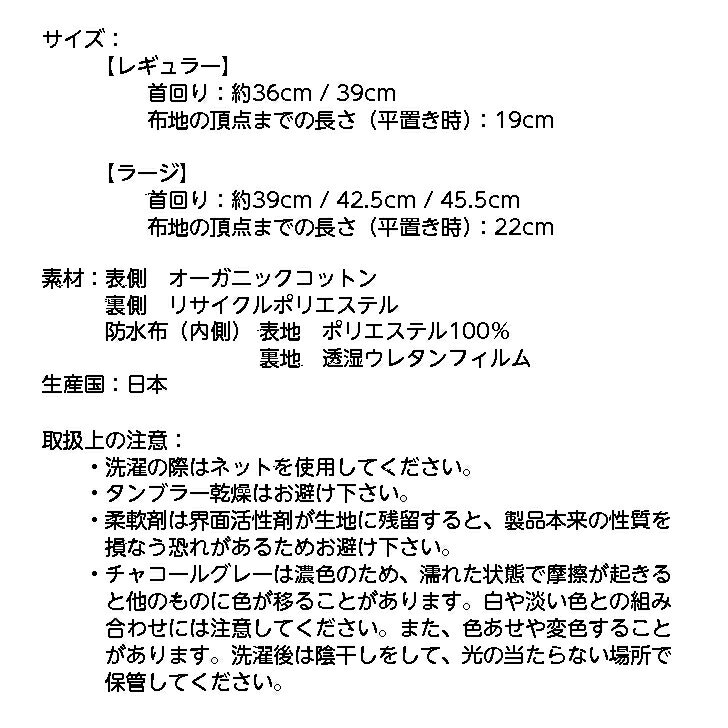 商品説明商品説明 IKOU Bib は、年齢や性別を問わずに使えるスタイ(よだれかけ)です。 肌に触れる表側はオーガニックコットン、裏側はリサイクルポリエステルのリバーシブル構造の素材により、肌へのやさしさと吸水速乾の機能を両立しています。 糸の選定からこだわり、オーガニックコットンとリサイクルポリエステルを掛け合わせた環境にも配慮した素材は、他にはないIKOUだけのオリジナルです。 中に防水シートが入っているため、よだれの多いお子さまでも、すぐにお洋服が汚れる心配がありません。 レギュラー(別ページにて販売中)/ラージの2サイズ展開で、どんなお洋服にも合わせやすいシンプルなデザインにより、赤ちゃんから大人まで幅広く使っていただけます。 サイズ 【ラージ】 首回り:約39cm / 42.5cm / 45.5cm 布地の頂点までの長さ(平置き時):22cm 素材 表側 オーガニックコットン 裏側 リサイクルポリエステル 防水布(内側) 表地:ポリエステル100% 裏地:透湿ウレタンフィルム 生産国:日本 カラー チャコールグレー モカ オフホワイト ピンク 取扱上の注意 ・洗濯の際はネットを使用してください。 ・タンブラー乾燥はお避け下さい。 ・柔軟剤は界面活性剤が生地に残留すると、製品本来の性質を損なう恐れがあるためお避け下さい。 ・チャコールグレーは濃色のため、濡れた状態で摩擦が起きると他のものに色が移ることがあります。 白や淡い色との組み合わせには注意してください。 また、色あせや変色することがあります。洗濯後は陰干しをして、光の当たらない場所で保管してください。
