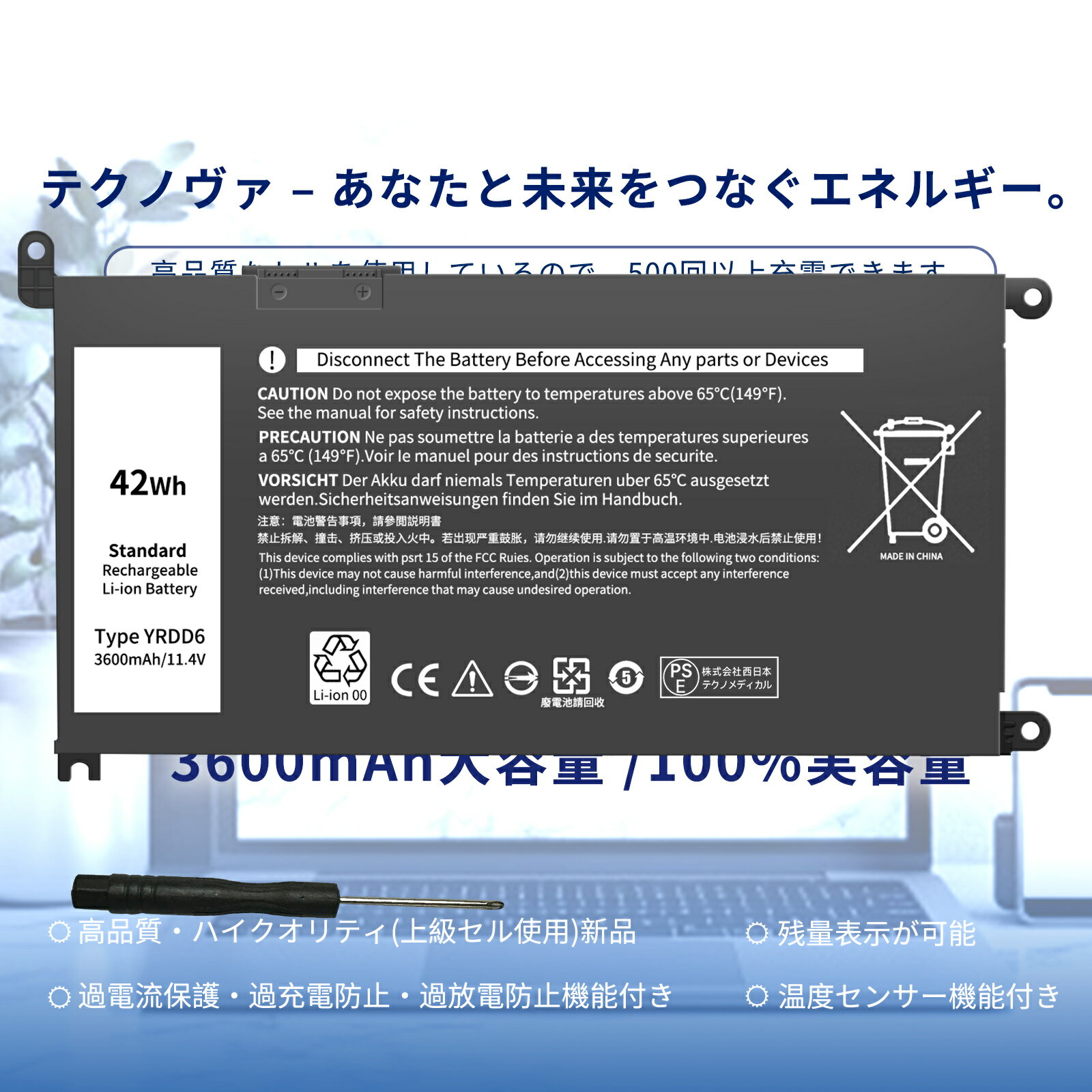 ●ブランド: DELL ●電圧: 11.4V ●容量: 3600mAh ●純正品型番(充電池コード): YRDD6,1VX1H,0YRDD6,VM732 0VM732,01VX1H ●対応機種: Latitude 3310,Latitude 3410,Latitude 3500,Latitude 3120 inspiron 5493,inspiron 5593,inspiron 5480,inspiron 5481 inspiron 5482,inspiron 5580,inspiron 5485,inspiron 5585 inspiron 5584,inspiron 5494,inspiron 5498,inspiron 5598 inspiron 5491,inspiron 5591,inspiron 5490,inspiron 5590 inspiron 5488,inspiron 5583,inspiron 5594,inspiron 3480 inspiron 3481,inspiron 3482,inspiron 3490,inspiron 3493 inspiron 3580,inspiron 3581,inspiron 3582,inspiron 3583 inspiron 3584,inspiron 3585,inspiron 3590,inspiron 3593 inspiron 3595,inspiron 3501,inspiron 3502,inspiron 3505 inspiron 3790,inspiron 3793,Vostro 3490,Vostro 3590 Vostro 3491,Vostro 3591,Vostro 3400,Vostro 3401 Vostro 3405,Vostro 3500,Vostro 3501 5581 5590 Vostro 5481 5490 ●メーカー型番: LBDELYRDD6XBK03-AAI-YBMXI Latitude 3500 ※この商品は互換用バッテリーです。 注意点: ●同じ性能で金額の異なる商品がございますが、製造元部品が異なるためであり、性能には一切違いはありません。ご安心ください。 ●多店舗で同時に販売するため、商品が一時的に欠品となる場合がございます。他の契約倉庫から出荷の手配を依頼することになり、発送日がまだ未確定で、ハッキリとご案内できませんので、弊社の出荷予定時間を参考にしてください。 ●当店でご購入された商品は、日本国内からお客様のもとへ直送されます。 ●一部商品は国内の提携先倉庫から配送されます。 ●製造年月及び製品の世代更新でpse申告業者も変わっています。品質的には問題ございませんので、ご安心ください。 ●PSEマークの種類:PSE ●届け出事業者名:株式会社西日本テクノメディカル ●個人輸入される商品は、全てご注文者自身の「個人使用?個人消費」が前提となりますので、ご注文された商品を第三者へ譲渡?転売することは法律で禁止されております。 ●国内配送の商品は国内でのお買い物と同じく消費税が発生いたします。 ●日付指定がなければ最短で出荷します。 ●本体機種の型番と純正バッテリーの型番は両方が一致していない場合、使用できない可能性があります。 ●ご購入前に、何かご不明点やご希望などございましたら、どうぞお気軽にお問合せ下さいませ。