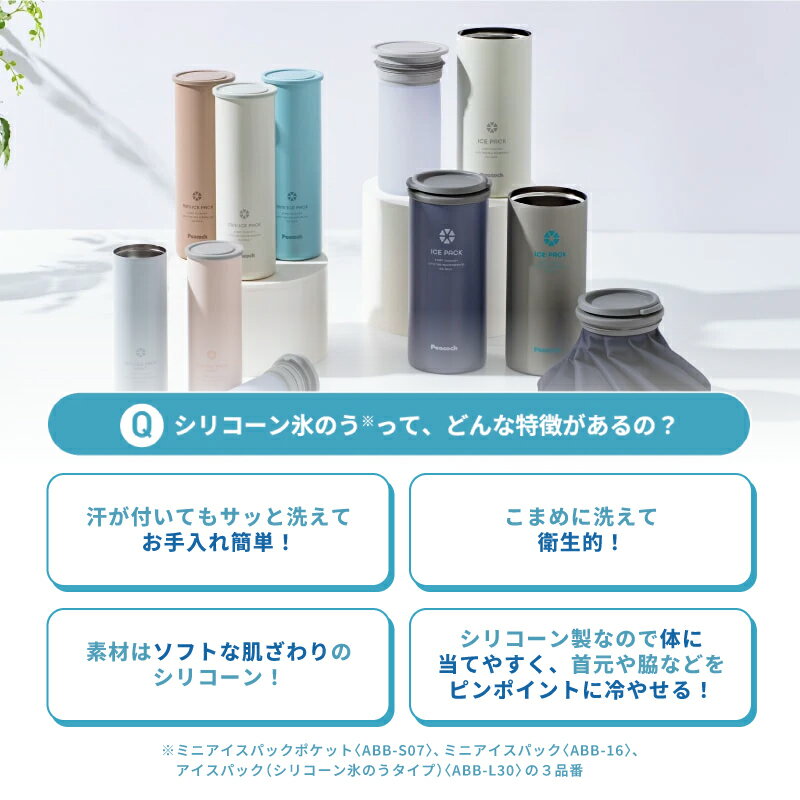 ピーコック魔法瓶 アイスパックシリーズ ピーコック魔法瓶のアイスパックシリーズは、真空断熱構造のホルダーと氷のうの組み合わせで、冷たさを長時間キープする携帯用保冷アイテムです。 熱中症対策やスポーツ後のアイシング、アウトドアや通勤・通学時のクールダウンなど、さまざまなシーンで活躍します。 ラインアップ ミニアイスパック ポケット(ABB-S07) ポケットに収まるコンパクトサイズで、携帯性抜群。お子様の通学やちょっとしたお出かけに最適です。 ミニアイスパック(ABB-16) スリムで使いやすい定番サイズ。首元や脇などを冷やして熱中症対策に。 アイスパック シリコーン氷のうタイプ(ABB-L30) 大容量で長時間の保冷が可能。アウトドアや長時間の外出におすすめです。 アイスパック 布氷のうタイプ(ABC-50) 布製氷のうが身体にしっかりフィット。スポーツ時のアイシングや発熱時のケアに最適です。 特長 真空断熱構造のホルダーで冷たさ長持ち。 用途に合わせて選べる4サイズのラインアップ。 繰り返し使えて経済的。 持ち運びに便利なコンパクト設計。 ご使用上の注意 布氷のうタイプは氷または氷水を入れてご使用ください。 使用後は氷のうをよく乾燥させて保管してください。 破損や漏れの原因となるため、尖ったものや硬いものを入れないでください。 ミニアイスパックポケット 本体サイズ 直径4.9cm、高さ14.5cm 重量 160g ミニアイスパック 本体サイズ 直径5.8cm、高さ17.0cm 重量 200g アイスパック 本体サイズ 直径7.6cm、高さ15.9cm 重量 290g アイスパック(布氷のうタイプ) 本体サイズ 幅7.9、奥行7.5、高さ16.9cm 重量 240g ■用途・使用シーン:氷のう アイシング 熱中症対策 魔法瓶 暑さ対策 ひんやり ネッククーラー 冷却 氷嚢 熱冷まし■メーカー型番:ABB-S07 ABB-16 ABB-L30 ABC-50 ■JAN:4971860037573 4971860037580 4971860037566 4971860036903 4971860036880 4971860036897 4971860037597 4971860037603 4971860037610 4971860037627\今年の夏、乗り切る準備できてますか?/
