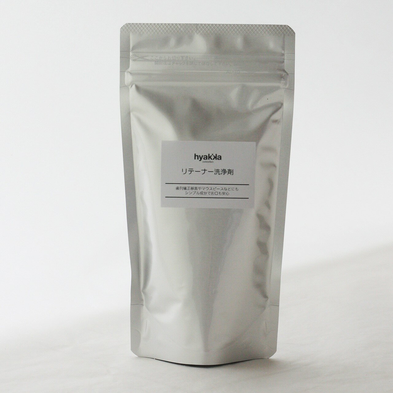 歯列矯正器具やリテーナー(保定器具)、マウスピースなどの洗浄剤です。主成分は過炭酸ナトリウム。界面活性剤や色素、増粘剤や結着剤などは一切使っていません。過炭酸ナトリウムから発生する過酸化水素が器具に付着した汚れや臭いを落とします。成分がシンプルなので濯ぎも簡単。いつまでもヌル付いた感じがなく、気持ちよい洗い上がりです。●使用方法1.容器に200ml程度の湯(40℃程度)を溜め、本品を小さじ1杯(約3g)入れる。2.リテーナーなどの食べかすを取り、5分程度液に浸す。より効果を求めたい時は30〜60分浸け置く。3.引き上げて水でよく濯ぐ。●量を調節しやすい顆粒タイプサラサラの顆粒タイプです。器具のサイズや形状、浸けおき容器の大きさによって使用量を簡単に調節できます。●スタッフのひとこと「リテーナーやマウスピース、歯列矯正器具の洗浄剤には『石けん百貨入れ歯洗浄剤』を!」とお勧めし、その後、たくさんの商品レビューとともに、名称を変えて販売してほしいという要望をたくさんいただいての、商品化です。大変お待たせしました。また、ご要望をありがとうございました。使用量の例ですが、娘の歯列矯正器具の場合、小さじ1/2(約3g)程度。160g入りですので、一袋で約2か月ほど使える計算です。オマケの使いみちをご紹介。洗面所の排水口が汚れてきたら、就寝前やお出かけ前にパラパラと振りかけてそのまま放置しています。数時間の放置で見事にキレイになりますよ!容量:160g成分:過炭酸ナトリウム、クエン酸、炭酸水素ナトリウムその他:日本製●ナチュラルリテーナー洗浄剤の使い方1.コップにぬるま湯を用意し、洗浄剤を小さじ1杯入れてください。白濁した洗浄液になります。洗浄剤の量は、器具の大きさや汚れなどに応じて調整して下さい。※目安・・・200mlに対して約3g程度。2.リテーナーや矯正器具などを入れます。リテーナーや矯正器具を入れると、そのよごれ(有機物)に反応してシュワシュワと発泡しながら洗浄を始めます。コップに軽くフタをすると水温が下がりにくいので、より効率的に洗浄できます。※密閉はしないで下さい。3.そのまま暫く付け置いて下さい。数分すると白濁が徐々に収まり、洗浄液の透明度が高くなりますが、洗浄は静かに続きます。通常の汚れなら5分程度で洗浄終了します。臭いや汚れが気になるときは30〜60分浸け置いて下さい。●気をつけて頂きたいこと・判断力の低下した方や小さなお子さま、ペットなどの手の届くところに洗浄中の浸けおき容器を放置しないでください。飲み物と間違えて口にする恐れがあります。・高温多湿を避けて保管して下さい。・他の容器に移し替えて保管する場合、完全密封で長期間蓋の開け閉めをしない状態での保管は避けて下さい。過炭酸ナトリウムから発生する微量のガスによって内圧が上がり、容器変形・破損などの可能性があります。※製品包装には空気穴が開いているためガス圧が高まりすぎる事はありません。 ●Q&A Q:医療用シリコン製のマウスピース(プレオルソなど)も使用できますでしょうか? A:一般的な素材(シリコン系樹脂、プラスチック系樹脂、合金類)で作られた器具であれば十分にお使い頂けます。 アルカリに弱いごく特殊な材質・造りの器具をお使いの場合にはご使用をお控えくださいませ。 ご心配な場合には、かかりつけの歯科医院等にご相談下さい。