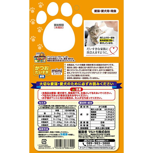 商品特徴・ペットフード(犬、猫用)の低塩分花かつお。・メーカー比塩分約25%カット(塩分0.9%以下)。・薄くスライスしていますので食べやすく、おやつに最適。・保存料、着色料不使用。・チャック付きの袋でおいしさを逃さず保存。原材料(成分)かつお節保証成分粗タンパク質65.0%以上、粗脂肪1.0%以上、粗繊維1.0%以下、粗灰分8.0%以下、水分21.0%以下エネルギー294kcal/100g原産国または製造地日本使用方法・ペットの健康状態、年齢、運動量を考慮した上でおやつとして、パッケージ記載の表を参考に1日1回~2回に分けてお与えください。※商品裏面に下表の記載あり保管方法・高温・高湿・直射日光を避け、保存してください。・開封後はチャックで口を閉じて冷蔵庫で保管し、できるだけお早めにお与えください。諸注意・本製品は愛猫・愛犬用で、間食用です。主食として与えないでください。・おいしさを保つための脱酸素剤は食べられません。・与え方・保存方法をお守りください。お子様がペットに与えるときは、大人が立ち会ってください。【商品サイズ】縦(mm) 170横(mm) 260高さ(mm) 35【商品重量】重量(g) 25JANCD:4902833886409【銀行振込・コンビニ決済】等前払い決済予定のお客様へ当商品は弊社在庫品ではなく、メーカー在庫品です。在庫確認後に注文確認を行い、お支払いのお願いを送信させて頂きます。休業日、14:00以降のご注文の場合は翌営業日に上記手続きを行います。お時間が掛かる場合がございます。