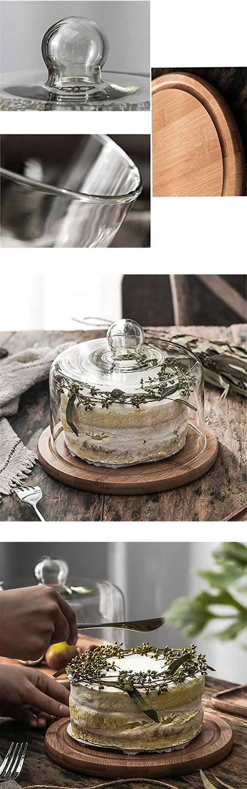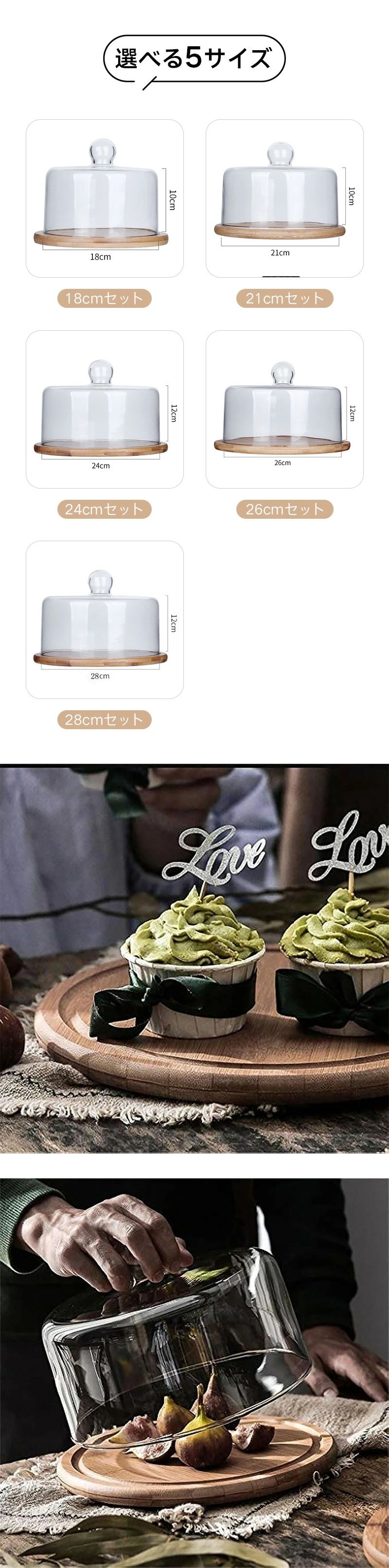 ガラスドーム ケーキカバー ケーキドーム ケーキスタンド デザートカバー デザートプレート お菓子カバー ふた 丸 透明 ケーキスタンド 竹製トレイ付き 家庭用