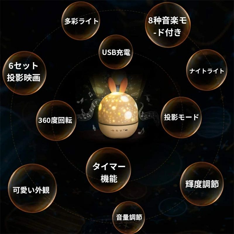 商品情報 【可愛い見た目&寝かしつけ用ベッドライト】 この商品は投影ランプと常夜灯として使用できます、普段はカバーをしてナイトライトとして使います。カバーを外し、フィルムをセットすると、様々な絵を天井や周辺の壁に映すことでき、綺麗な空間演出します。海の世界、宇宙、お誕生日祝い、星空とクリスマスの6種類投影映画フィルムが付属して、シーンによっていい雰囲気を作りだします。 【360度回転&音楽再生 】 回転ボタンを押すと、本体が360度で回転しながら天井や壁に投影される星空や海の生物も動きます。音楽は8曲付いています。部屋に美しい映像をしながら音楽再生しますこと、素晴らしい雰囲気を創造します。 子供と一緒に天井を眺めて幸せになるでしょう。 【無段階調光&多色変更】 ライトボタンを押すと、点灯パターンの切り替えやライトの明るさの調整が可能です。黄、白や青の三色のLEDライトが内蔵され、単色黄、単色白、単色青、三色の早い点滅、三色のグラデーション、三色のゆっくり点滅という六つ種類点灯パターンがあります。そしてリモコンを使って光の明るさを調節します。 【USB充電式】 バッテリーを内蔵して、付属の USBケーブルをモバイルバッテリやパソコンなどに接続して充電できます。充電時間は2時間ぐらいです。一度フル充電すれば、数時間使用可能です。また、小さくて軽くて持ち運びに便利でいろいろな場所で利用できます。 【適用場所】 赤ちゃん室やお年寄りのベッドルームなどの室内などにライトレイト・常夜灯・ベッドサイドランプとしては最適です。 またパーテイー、学園祭などの場合に飾りライトとして、子供、彼女、家族、友達への誕生日プレゼントやギフトにもお勧めです。