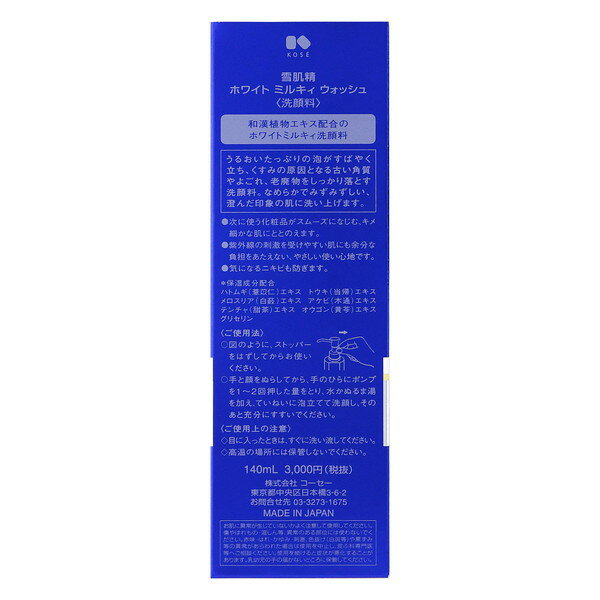 特徴雪肌精 ホワイト ミルキィ ウォッシュ (洗顔料) : 140mL 3,000円 (税抜) 。和漢植物エキス配合のホワイトミルキィ洗顔料。うるおいたっぷりの泡がすばやく立ち、くすみの原因となる古い角質やよごれ、老廃物をしっかり落とす洗顔料。なめらかでみずみずしい、澄んだ印象の肌に洗い上げます。次に使う化粧品がスムーズになじむ、キメ細かな肌にととのえます。紫外線の刺激を受けやすい肌にも余分な負担をあたえない、やさしい使い心地です。気になるニキビも防ぎます。保湿成分配合 : ハトムギ (?苡仁) エキス、トウキ (当帰) エキス、メロスリア (白?) エキス、アケビ (木通) エキス、テンシャ (甜茶) エキス、オウゴン (黄?) エキス、グリセリン。商品重量など206g高さ169mm×幅54mm×奥行42mm使用方法図のように、ストッパーをはずしてからお使いください。手と顔をぬらしてから、手のひらにポンプを1〜2回押した量をとり、水かぬるま湯を加え、ていねいに泡立てて洗顔し、そのあと充分にすすいでください。使用上注意目に入ったときは、すぐに洗い流してください。高温の場所には保管しないでください。お肌に異常が生じていないかよく注意して使用してください。傷やはれもの、湿しん等、異常のある部位には使わないでください。赤味、はれ、かゆみ、刺激、色抜け (白斑等) や黒ずみ等の異常があらわれた場合は使用を中止し、皮ふ科専門医等へご相談ください。使用を続けると症状が悪化することがあります。乳幼児の手の届かないところに保管してください。その他広告文責:株式会社コーロ 06-6344-8588メーカー:株式会社コーセー商品名:雪肌精 雪肌精 ホワイト ミルキィ ウォッシュ 140mL生産国:日本商品区分:化粧品