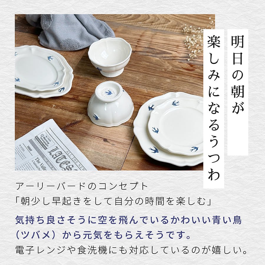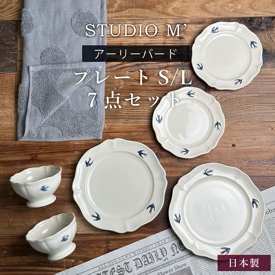 ガティ/プチガティプレート単品 エピスマグ単品 ガティペア9点セット ガティペア11点セット ヴィーニュ プレート単品 ヴィーニュペア 5点セット アーリーバード プレート単品 アーリーバードプチボウル アーリーバード7点セット 品名 STUDIO M' アーリーバード 食器ペアセット 製造国 日本 サイズ 【オーバル】 プチボウル:φ10.7 × H6.2cm 230ml プレートS:19.2×13×2cm プレートL:22.7×15.4×2cm ループ付きタオル/33×33cm 【ラウンド】 プチボウル:φ10.7 × H6.2cm 230ml プレートS:φ15×H2cm プレートL:φ19.5×H2.2cm ループ付きタオル/33×33cm 素材 磁器 / 下絵付・透明釉 / 酸化 ループ付きタオル/綿100% 明細について 当店では、明細書など金額のわかるものはお付けしておりません。 製品について 【色幅】 商品の色に個体差があります。季節や気温などの自然条件や、釉薬と焼成する際の火加減によって、器は様々な表情を見せます。同じ素材の器であっても、まったく同じ色に焼きあがることは非常に珍しく、100個あれば、それぞれが違った表情を見せてくれます。 【色ムラ】 一個体の中で、釉薬や化粧土のムラがでます。1つの器の中において、色の表情が均一ではない箇所がある場合があります。器の形状などにより、釉薬の掛かり方が厚かったり、薄かったりする箇所があることが一つの要因です。それにより土の表情が一つの器のなかにおいても変化を見せます。 【釉垂・化粧垂】 釉薬や化粧土が垂れたようになる場合があります。釉薬や化粧土を手作業でかけることによるムラや、焼成中の釉薬の流れにより、釉薬がたれた状態になります。 【電子レンジ対応】※注意あり 電子レンジはマイクロ波で食材を加熱します。多くの場合は水分を加熱しますが、炭化した(焦げた)部分にはマイクロ波が集中し、他の部分より温度が上がる場合があります。例えば野菜炒めの炭化した(焦げた)部分にマイクロ波が集中して、器の中で大きい温度差が生まれ、破損する場合があります。また、水分だけでなく油分も加熱されます。油分の方が水分より沸点が高く、より高温となり、油分の含まれた部分と含まれていない部分に非常に大きい温度差が生まれ、破損する場合もございます ○電子レンジご使用後の熱くなった器を水に浸したり、冷たい調理台に置いたりしないでください。また冷凍食品を入れて急激な加熱や、冷蔵庫から出した器をすぐに電子レンジに入れることはお止めください。急激な温度変化を与えると貫入や破損の原因となります。 【 食洗機対応 】 ○食洗機内で器同士がぶつかると、破損します。 ○殆どの陶磁器は水分を吸収します。表面上乾いた様に見えても、器の中には水分が残っている場合がございます。カビや匂いの発生の原因となるため食洗機使用後は速やかに取り出し、外気に触れる場所での十分な乾燥をするようにお願い致します。 ※その他、商品付属のご注意をよくお読みになりご使用ください。 確認事項 ※商品の色味はなるべく実際の商品に近い色味でお伝えすべく撮影及び画像処理には気を配っておりますが、ページをご覧頂くモニターなどの環境により色味・風合いは多少異なる場合がございます。予めおご了承ください。商品に関するご質問、ご不明な点がございましたら、ご注文前にお問い合わせください。 \ 食器ギフトセットは様々なお祝い事にオススメです / # 結婚祝い # 新築祝い # 新居祝い # 引越祝い # 夫婦 # カップル # 親友 # 友人 # 同僚 #兄弟 # 姉妹 # 上司 # 部下