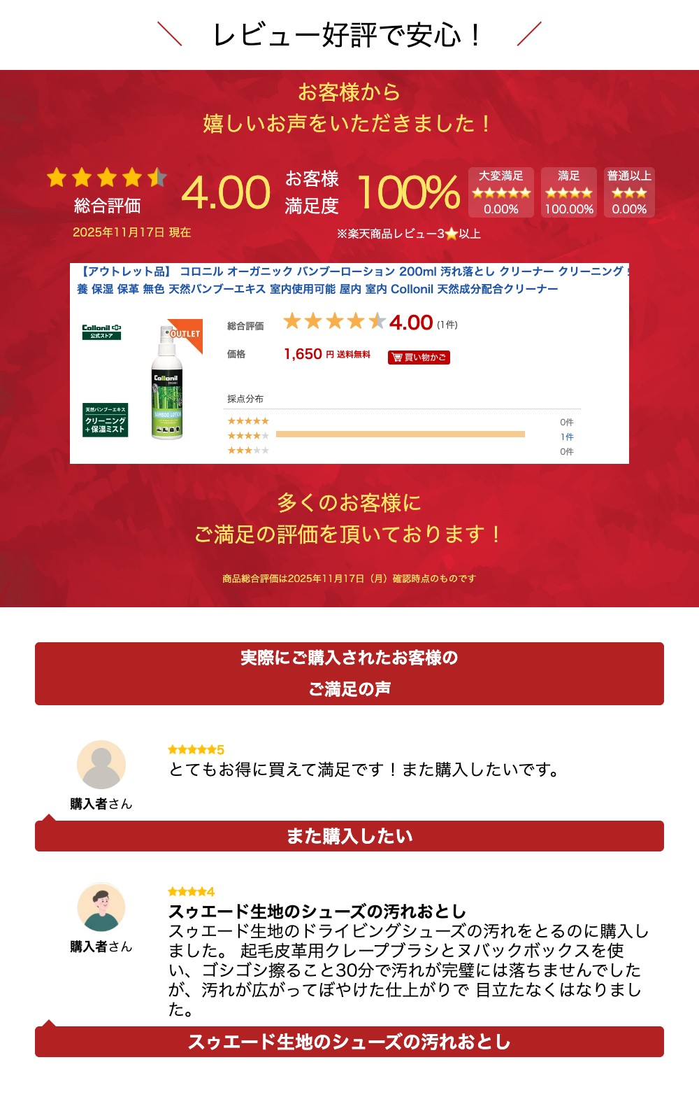 【ブランド】 コロニル Collonil 【商品名】 オーガニック バンブーローション 【原産国】 ドイツ 【容量】 200ml 【特長】 天然のバンブー(竹)から抽出したエキスを配合したクリーニングと保湿効果を与えるローションです。バンブーエキスの優れた保湿効果により、クリーニングと同時に素材に潤いを与え乾燥から守ります。環境に配慮した気化ポンプで噴射するので、室内でも使用できます。 【使用対象製品】 靴、バッグ、ウェア、小物など 【使用対象素材】 スムースレザー、起毛皮革(スウェード、ヌバック、ベロア、ムートン)、テキスタイル 【サイズ(約)】 18.0cm(H)×5.0cm(W) 【カラー】 カラーレス 【主要成分・素材】 界面活性剤、バンブーエキス、香料 【仕様】 プラスティックミストボトル 【使用方法】 対象素材・製品表面のホコリを布やブラシで落としてください。容器を良く振り噴射口を水平にし約20cm離して汚れた箇所にスプレーしてください。スムースレザーは綺麗な布で軽く擦って汚れを落としてください。乾いた後、ポリッシングクロスで乾拭きしてください。起毛皮革、テキスタイル素材は軽くブラッシングして汚れを落としてください。 【アドバイス】 ■使用後はキャップをしっかり閉めてください。 【使用上の注意】 上記の対象素材・製品以外には使用出来ません。 一部特殊素材にシミ、色落ちの出る場合がありますので目立たない箇所でお試しください。 湿った皮革には使用しないでください。 【備考】 メーカー希望小売価格はメーカーカタログに基づいて掲載しています