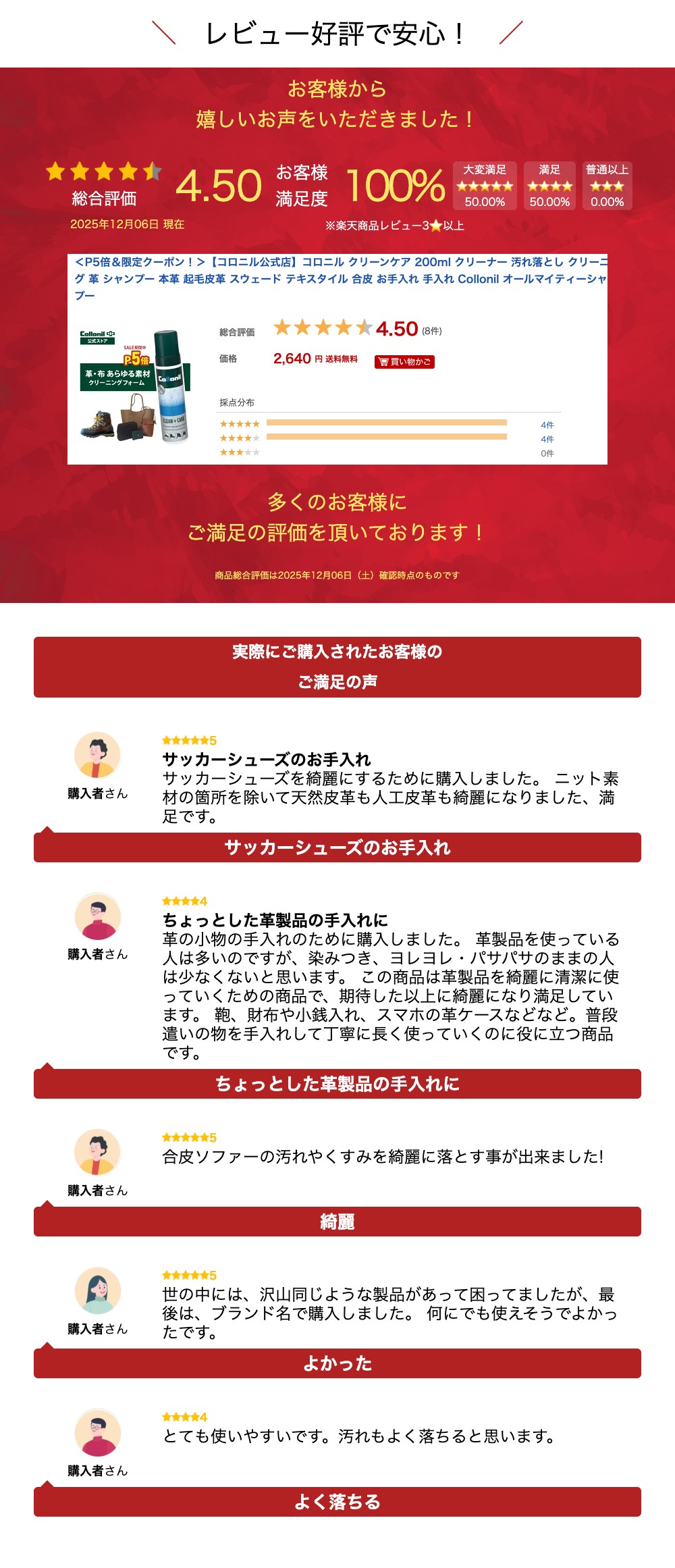 【ブランド】 コロニル Collonil 【商品名】 クリーン&ケア 【原産国】 ドイツ 【容量】 200ml 【特長】 スムースレザー、起毛皮革、合成皮革、テキスタイル素材の汚れを落とす成分と皮革を保護する成分が配合されたクリーニング+コンディショニングフォームです。幅広い種類の素材に使用でき、頑固な汚れを落とし、風合いを保ちます。 【使用対象製品】 靴、バッグなど 【使用対象素材】 スムースレザー、起毛皮革(スウェード、ヌバック、ベロア)、合成皮革、テキスタイル 【サイズ(約)】 21.0cm(H)×4.8cm(W) 【カラー】 − 【主要成分・素材】 界面活性剤、防腐剤、香料 【仕様】 プラスティックポンプボトル 【使用方法】 対象素材・製品表面のホコリを布やブラシで落としてください。容器を良く振りノズルを回しロックを解除してください。ノズルを押しポリッシングクロスにフォームを適量取り、まんべんなく塗布して汚れを落としてください。その後、軽く湿らせた布で拭き取って陰干ししてください。スムースレザーは乾いた後、ポリッシングクロスで乾拭きしてください。起毛皮革は乾いた後、ブラッシングして毛並みを整えてください。テキスタイル素材は乾いた後、ブラッシングして仕上げてください。 【アドバイス】 ■ご使用後はフォームをよく拭き取るか水で充分にすすいでください。 ■汚れが激しい場合は、本商品を使用した丸洗いが効果的です。対象製品を濡らし、クリーン&ケアを泡立てながらブラシで洗います。よくすすいで水分を切り、陰干ししてください。 【使用上の注意】 上記の対象素材・製品以外には使用出来ません。 一部特殊素材にシミ、色落ちの出る場合がありますので目立たない箇所でお試しください。 湿った皮革には使用しないでください。 関連商品<P5倍&限定クーポン!>【コロニル公式店】コロニル オーガニック バ...<P5倍&限定クーポン!>【コロニル公式店】コロニル アクティブ クリ...<P5倍&限定クーポン!>【コロニル公式店】コロニル 1909レザーク...2,640円2,090円2,530円<P5倍&限定クーポン!>【コロニル公式店】コロニル デリケートクリー...<P5倍&限定クーポン!>【コロニル公式店】エナメル お手入れ クリー...<P5倍&限定クーポン!>【コロニル公式店】コロニル ソフトガミ 革用...1,650円1,980円990円<P10倍&限定クーポン!>!本革&合皮に【コロニル公式店】コロニル ...<P10倍&限定クーポン!>【コロニル公式店】ライニガー 200ml ...<P5倍&限定クーポン!>【コロニル公式店】コロニルブルー ハイジーン...1,980円1,980円1,540円コロニル クリーン&ケア 200ml Collonil CLEAN & CARE オールマイティーシャンプー