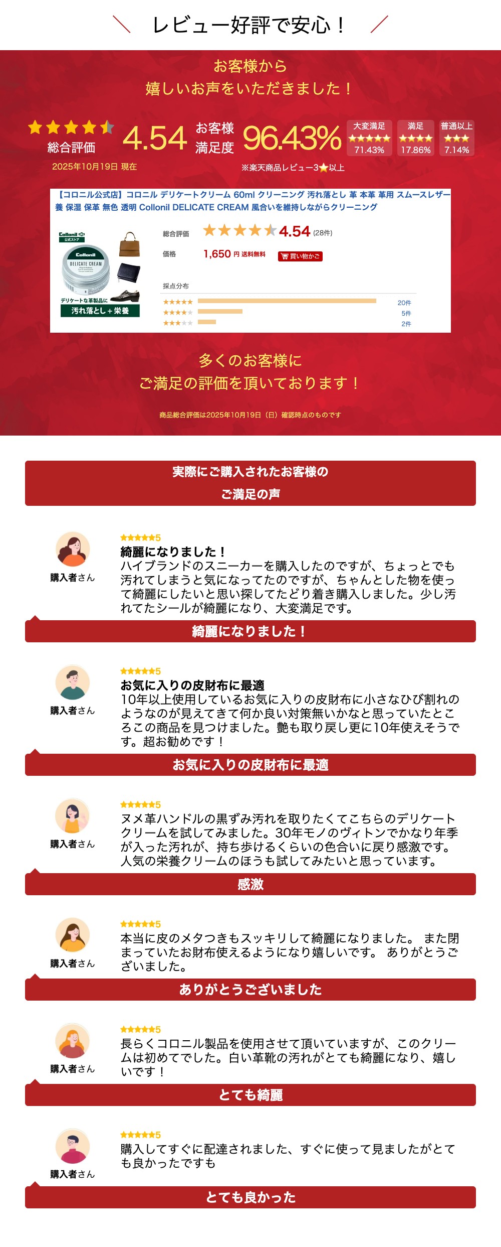 【ブランド】 コロニル Collonil 【商品名】 デリケートクリーム 【原産国】 ドイツ 【容量】 60ml 【特長】 デリケートな仕上げのスムースレザー製品表面の風合いを維持しながら汚れを落とします。 【使用対象製品】 皮革製品全般 【使用対象素材】 スムースレザー 【カラー】 カラーレス 【主要成分・素材】 ろう、有機溶剤、界面活性剤 【仕様】 蓋:ブリキ 容器:プラスティックジャー 【使用方法】 対象素材・製品表面のホコリや汚れを布やブラシで落としてください。ポリッシングクロスに適量取り、汚れた部分を軽く擦って汚れを落としてください。乾いた後、ポリッシングクロスで乾拭きしてください。 【アドバイス】 ■本商品は栄養効果も含まれておりますが、主用途はクリーニングです。 より一層の栄養を与えたい場合は、ゲルなどの栄養クリームを併用してください。 【使用上の注意】 上記の対象素材・製品以外には使用出来ません。 一部特殊素材にシミ、色落ちの出る場合がありますので目立たない箇所で試して下さい。 ※湿った素材には使用しないで下さい。 【備考】 予告なく商品の仕様が変更される場合があります。 関連商品【コロニル公式店】コロニルブルー ハイジーンフォーム 125ml 除菌...【コロニル公式店】コロニル アクティブ クリーナー 200ml 登山靴...本革&合皮に【コロニル公式店】コロニル レザーソープ 200ml 革 ...1,540円2,090円1,980円【コロニル公式店】ライニガー 200ml コロニル 革 レザー ヌメ革...エナメルの汚れ&ベタベタに【コロニル公式店】エナメル お手入れ クリー...【コロニル公式店】コロニル クリーンケア 200ml クリーナー 汚れ...1,980円1,980円2,640円【コロニル公式店】コロニル シリコンポリッシュ 75ml クリーナー ...【コロニル公式店】コロニル オーガニック バンブーローション 200m...「消しゴムタイプ」クリーナー【コロニル公式店】コロニル ソフトガミ 革...1,540円2,640円990円コロニル デリケートクリーム 60ml Collonil DELICATE CREAM 風合いを維持しながらクリーニング