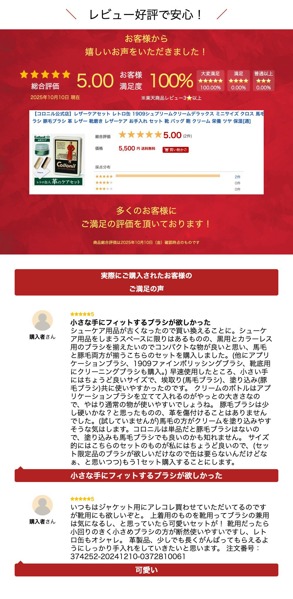 【ブランド】 コロニル Collonil 【商品名】 1909レザーケアセット レトロ缶 【セット内容・容量】 ■1909シュプリームクリームデラックス/カラーレス:20ml ■馬毛小ブラシ ■豚毛小ブラシ ■ポリッシングクロス 【原産国】 ■1909シュプリームクリームデラックス:ドイツ ■馬毛小ブラシ、豚毛小ブラシ、ポリッシングクロス:台湾 【特長】 ミニサイズの1909シュプリームクリームデラックス(カラーレス)、コロニルのロゴ付き馬毛小ブラシ、豚毛小ブラシ、そしてお手入れに欠かせないポリッシングクロスが入った日本限定の特別なセットです。BOX(缶)はお手入れ道具の収納にご使用いただけます。パッケージデザインには、過去ドイツで実際に使われていた、コロニルのレトロな広告イラストを採用しました。ご自分へのご褒美や大切な方への贈り物にもぴったりなセットです。 【使用対象製品】 靴、バッグ、ウェア、小物、家具等 【使用対象素材】 スムースレザー = ※表面が起毛していない本革 【主要成分・素材・サイズ】 ■1909シュプリームクリームデラックス:シーダーウッドオイル・ラノリン ※有機溶剤は使用しておりません。 (約)容器上部(蓋部分)3.8cm×容器下部(底部分)4.2cm×高さ2.9cm ■馬毛小ブラシ:毛:馬毛 / 本体:ブナ (約)縦4.1cm×幅13.5cm×厚み3.5cm ■豚毛小ブラシ:毛:豚毛 / 本体:ブナ (約)縦4.0cm×幅13.5cm×厚み3.2cm ■ポリッシングクロス:コットン100% (約)34.0cm×34.0cm ■外箱(缶):(約)縦17.4cm×横12.4cm×高さ4.5cm 【使用方法】 ・馬毛ブラシやクロスで革表面のホコリや汚れを払います。汚れが気になる時は、表面に付着した軽い汚れであればクリームを少量クロスに取って、汚れを拭き取ります。 ・クリームをクロスに少量取り、皮に均一に塗布します。使用量は30cm四方に真珠玉1粒分程度が目安。塗りすぎないように注意し、足りない部分には必要に応じて塗り足します。 ・塗布後、豚毛ブラシでよくクリームを刷り込み、余分を取り除きます。 ・クロスで乾拭き、馬毛ブラシでブラッシングして仕上げます。 【使用上の注意】 ・各商品ラベルに記載されているご使用方法、ご注意点をご確認のうえご使用ください。 ・必ず目立たない箇所でお試しのうえ、全体にお使いください。 ・クリームは、塗りすぎると革の表面を白くしてしまいますので、必ず少量ずつ塗り足すようにしてお使いください。 関連商品【コロニル公式店】コロニル 1909 最高級 栄養ケア 3点セット 革...【コロニル公式店】1909トライアルキット 革製品のお手入れ クリー...【コロニル公式店】1909 最高級 防水+栄養・保湿ケア 3点セット ...5,940円1,980円6,490円【コロニル公式店】コロニル コンビホワイト 100ml 白靴用 着色ロ...革製靴底のお手入れに!【コロニル公式店】コロニル ソールトニック 10...【コロニル公式店】スウェード靴 しっかり お手入れセット 起毛皮革 ス...1,430円1,650円8,140円【コロニル公式店】シューキーパー コロニル アロマティックシーダーシュ...【コロニル公式店】コロニル 1909ワックスポリッシュ 75ml 靴 ...【コロニル公式店】コロニル シュークリーム 60ml 靴専用クリーム ...5,940円1,980円1,320円【コロニル公式ストア】レザーケアセット レトロ缶