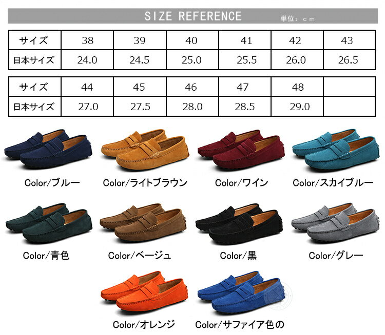 商品情報 商品名 ドライビングシューズ スリッポン メンズ スウェード ローファー 大人 革靴 カジュアル シューズ デッキシューズ フォーマル ビジネス モカシン 軽量 素材 アッパー:PUレザー ソール:ゴム底 カラー ブルー ライトブラウン ワイン スカイブルー ネイビー ベージュ 黒 グレー オレンジ サファイア色のサイズ 38(24.0cm) 39(24.5cm) 40(25.0cm) 41(25.5cm) 42(26.0cm) 43(26.5cm) 44(27.0cm) 45(27.5cm) 46(28.0cm) 47(28.5cm) 48(29.0cm) 生産国 CHINA 包装について 環境保護の観点から、「簡易包装」を推進しております 明細書について 当店ではエコロジーと個人情報流出防止のため、ご指示の無い限り明細書を発行しておりません。 明細書を発行ご希望の場合は個別に承らせていただきます。 お手数おかけいたしますが、ご注文時に備考欄に明細書発行希望の旨、ご入力ください。 配送について 当店は複数の保管倉庫を契約しており、複数商品をご注文の場合、商品保管倉庫により、それぞれ出荷する場合があります。 時間指定は下記よりお選びいただけます。 午前中、14-16時、16-18時、18-20時、19-21時 在庫に関するお知らせ 当社では複数店舗を運営し他店舗でも販売しております為、万一、商品の品切れ等によりお届けできない場合、 またはお届けが遅れる場合がございます。 その際には当方よりメールにてご連絡を差し上げま すが、あらかじめご了承下さいますようお願い致します。 注意 ※日本サイズ表示ではなく、ご購入前にぜひともサイズ表をご確認ください。 ※機械による生産過程により、生地を織る際の糸の継ぎ目や多少のほつれなどが生じている場合がございます。 ※サイズは平置き、メジャー採寸を行っております。 実寸は商品によって若干の誤差が生じる場合がございます。予めご了承ください。 ※お客様のご覧になられますパソコン機器及びモニタなどの違い、また室内、室外での撮影により実際の商品素材の色と相違する場合もありますのでご了承下さい。 ※※ベルト、飾りやインナーなどは含みません。
