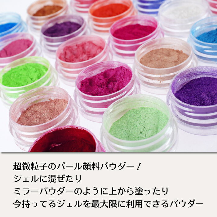 トップコートの上から塗って偏光ネイルにしたり、カラージェルやクリアジェルに混ぜて色をつけたり、 色々できるパールのニュアンスパウダー! 超微粒子だから、解けやすくて、ギラギラしない! 超微粒子=ものすごく細かい粉 クリアジェルに混ぜても、レジンに混ぜてもOK! ミラーパウダーのように、完全硬化した表面にこすりつけてもキラキラ感のある表面が作れます。 また、レジン液に混ぜて1層目のベースカラーを作るのに最適です。ジェルやレジンに溶けやすく発色も抜群!クリアジェル4に対し顔料1の割合で混ぜてご使用ください。不透明度を出したいときは二度塗りしてください。顔料の量を多くすると紫外線が底面まで届かず固まりにくくなります。