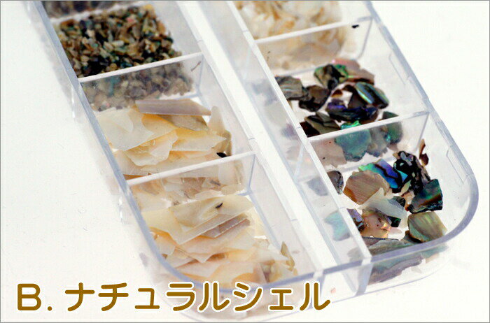 本物の貝殻パーツです。 A.のカラーシェルは、少し厚めに砕いた貝殻の角を丸く加工し、着色しました。自然なパールの輝きと貝の模様のグラデーションがユニークです。 コロンとしたちょっと厚めのシェルはネイルに盛って使うのがオススメ! B.のナチュラルシェルは、着色をせず、本来の貝の輝きをそのまま表現しています。 ◆A.Bどちらかを選んでご注文してください