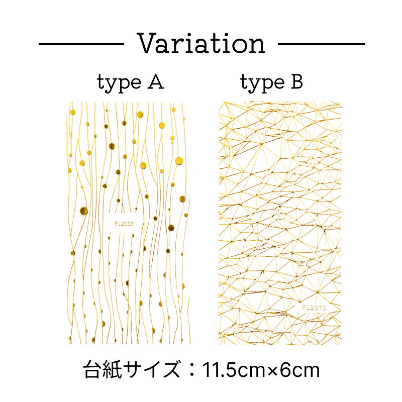 ドットや網目模様が特徴的なネイルシール!! 自分でデザインするのは難しいけど、ネイルシールなら貼るだけで簡単に可愛いアートが出来ちゃう♪ 薄いシールなので埋め込みやすく、台紙から剥がしてそのまま爪に乗せるだけ! ゴールドラインで華やかな指先に! 【使い方】 1.お好みのベースデザインを作り仮硬化します 2.シールをピンセットで台紙から剥がします 3.表面にシールを貼りデザインを整えます 4.トップコートを塗り硬化します 完成です! 【入数】 1枚(台紙サイズ縦約11.5cm:横6cm) 2typeからお好きなカラーをお選びください。 【注意事項】 ・ご利用の際はピンセットなどで丁寧に台紙から剥がしてください。 ・入荷した時期やご覧の端末により、色味に若干の差異が発生することがありますので、あらかじめご了承ください。 ・お使いのブラウザやPC画面設定により、カラーが異なって見える場合がございます。