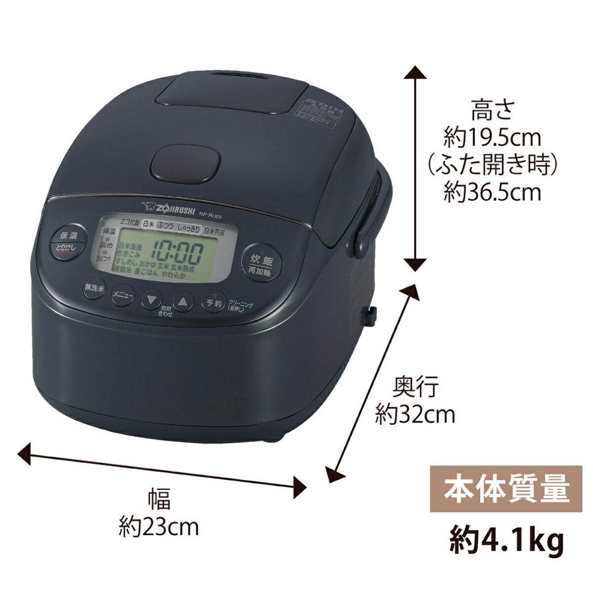 サイズ約 幅23×奥行32×高さ19.5(cm)重量約 4.1kg容量3合炊き内容量1個付属品:計量カップ、立つしゃもじ種類スレートブラック、ホワイト生産国日本製電源交流 100V 50/60Hz消費電力700Wコードの長さ1.0m(コードリールつき)備考※メーカー保証を受けられる際は、商品に同梱されている保証書、購入日がわかるもの(領収書や納品書など)が必要になります。区分返品・キャンセル区分(不可)ギフトラッピングページを見る●少量からおいしく炊ける3合炊き圧力IH炊飯器です。●「圧力炊飯」+「全面加熱」で甘くてもちもちのごはんを炊きあげます。●3通りの「炊き分け圧力」でごはんを好みの食感に炊き分けます。●「うるつや保温」機能で、30時間おいしく保温できます。●お米の栄養素を引き出す「熟成炊き(白米・玄米)」を搭載しています。●食べやすく、おいしく炊ける「無洗米」「麦ごはんメニュー」を搭載しています。おすすめポイント少量からおいしく炊ける3合炊き1~2人暮らしにぴったりな3合炊きの炊飯器です。お茶碗1杯分0.5合から炊飯可能で少量からでもおいしく炊けます。コンパクト且つ、機能にもこだわりたいという方にぴったりの炊飯器です。高温で炊くからごはんが甘くてもちもちもちもちした甘いごはんを炊きあげるポイントは、「圧力炊飯」+「全面加熱」です。圧力を一定にかけ続け、100度以上の高温を維持することで釜内に激しい対流を引き起こしてアルファ化を促進し、お米の甘み成分を引き出します。 また、ふきこぼれを気にせず、沸とう後も強火でごはんを炊き続ける「豪熱沸とう」で、芯までふっくらしたごはんが炊き上がります。ごはんを好みの食感に3通りの「炊き分け圧力」圧力の強さと圧力をかける時間を調整して、ふつうだけでなく、すしめしや、しゃっきりまで、メニューにあわせて3通りの食感に炊き分けます。簡単にご家庭の好みに合わせた炊き方を選べます。商品詳細30時間おいしく保温できる「うるつや保温」底センサーが保温に最適な火加減で温度コントロールします。水分の蒸発を抑え、30時間までおいしく保温します。(メニューによって異なります。取扱説明書をご確認ください。)また、長時間の保温はしないが、よりあたたかいごはんを食べたい方におすすめの「高め保温」メニューがあります。お米の栄養素を引き出す「熟成炊き(白米・玄米)」時間をかけ水に浸し、芯までじっくり吸水させる「白米熟成」「玄米熟成」メニューを搭載しています。芯まで行き渡った水は、お米の芯からアルファ化を促進し、ふっくらおいしくなります。おいしく炊ける「無洗米」メニュー水を加えるだけで炊飯できる無洗米専用のメニューです。火力を高めた専用の炊き方で、ごはんの甘みを引き出します。雑穀米、麦ごはんなど、多彩な炊き方に対応できます。食べやすく、おいしく炊ける「麦ごはんメニュー」健康に気を遣う方に大人気のもち麦や押し麦も麦の風味を活かしながらふっくらもちもちに炊き上げる専用のメニューがあります。その他の特徴・釜全体に熱が伝わる「黒まる厚釜」(※内釜のフッ素加工は3年間無償交換します。取扱説明書の記載事項にそわない使い方をされた場合は対象外です。)・炊きこみごはんの後など、ニオイが気になる時に便利な「クリーニング」機能・やさしい食感に炊き上げる「やわらか」メニュー・お手入れ簡単「洗える内ぶた」「フラット庫内(サイドセンサー部は除く)」・銀イオン抗菌加工「立つしゃもじ」&「プッシュボタン」・いつでも簡単に取扱説明書が確認できる2次元コードつき※こちらはNP-RU05のページです。カラーサイズシリーズ紹介ごはんを好みの食感に、選べる3通りの「炊き分け圧力」炊きムラを抑えて芯までふっくら炊き上げる495W(最大電力)のハイパワーでふっくら炊き上げる関連キーワード:電気 自動 電動 調理家電 キッチン家電 すいはんき コンパクト 多機能 雑穀米 1人暮らし ひとり暮らし 2人暮らし 炊き分け メニュー おいしい 美味しい おいしく炊ける うるつや うちがま 内釜 計量カップ付き 初心者 新生活 新生活準備 台所用品 料理道具 調理用品 調理道具 キッチングッズ キッチンアイテム 調理器具 お手入れ簡単 洗いやすい スタイリッシュ 白 黒 ブラック LH17241 LH16706 NP-RU05関連商品はこちら象印 マイコン炊飯器 3合炊き 極め炊き 黒厚21,780円象印 圧力IH炊飯器 4合炊き 極め炊き 黒ま56,980円象印 圧力IH炊飯器 5.5合炊き 極め炊き 38,980円象印 マイコン炊飯器 3合炊き 極め炊き 小容19,580円象印 圧力IH炊飯器 5.5合炊き 極め炊き 44,280円象印 圧力IH炊飯器 1升炊き 極め炊き 黒ま42,280円象印 IH炊飯器 3合炊き 極め炊き 黒まる厚26,800円象印 IH炊飯器 5.5合炊き 極め炊き 黒ま35,980円象印 圧力IH炊飯器 1升炊き 極め炊き 豪炎47,280円象印 マイコン炊飯器 3合炊き 極め炊き 黒ま11,780円象印 IH炊飯器 1升炊き 極め炊き 黒まる厚41,480円象印 IH炊飯器 1升炊き 極め炊き 黒まる厚24,980円