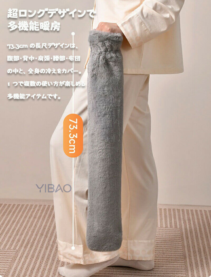 ▼商品紹介▼ 超ロングデザインで多機能暖房 73.3cm の長尺デザインは、腹部・背中・肩颈・腰部・布団の中と、全身の冷えをカバー。1 つで複数の使い方が楽しめる多機能アイテムです。 安心・快適な素材と構造 保温外套:ふわふわの肌触りで熱を長持ちさせ、直接触れても火傷しない安全設計。 波紋内胆:滑りにくく、水洗いも可能で清潔に保ちやすい。 ネジ式密封栓:しっかりと密閉し、水漏れを徹底防止。 使いやすさにこだわった細部 大口径注水口(30mm):お湯の注入が簡単でこぼれにくい。お湯は 2/3 程度、温度は 80℃が最適です。 取り外し可能な外套:汚れたら簡単に外して洗えるので、常に清潔に保てます。 安全と品質の二重保障 環境対応素材:無臭のゴム内胆で、丈夫で長期間使用可能。 安全防爆設計:過度な圧力にも耐え、安心して使用できる構造です。 長時間恒温:最大 10 時間の保温力で、一晩中暖かく深い眠りをサポートします。 使い方 注水口の栓を緩め、80℃程度のお湯を 2/3 程度注入します。 栓をしっかりと締め、外套を装着します。 温めたい部位に当てるか、布団の中に入れて使用します。 【注意事項】 ※製品更新により、予告なしで同じ商品がデザイン、色若干変わる場合がございますので、予めご了承下さい。 ※撮影の為、画質等の関係上、色などが実際の商品と若干違ってしまうこともあるかもしれませんがご理解のほどご購入ください。予めご了承ください。 ※更新のタイミングによっては実在庫に相違が出る場合がございます。 ※万が一商品に不具合がある場合は、無償交換・返金は可能です。マイナス評価する前にご遠慮なく当店と連絡してください。 ※重要※<オプション品ご購入の注意点> 楽天決済のシステム上、追加料金が自動加算されません。注文確定後に金額修正し、メールにてお知らせしますが、ご確認ください。