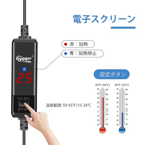 hygger 水槽ヒーター 45cm用 15-34[度]設置 過熱保護 空焚き防止 石英防爆ガラス 温度調節可能 縦横設置 水中用 ミニヒーター 吸盤付き 20-40L淡水・海水水槽に適用 25W 25W水槽ヒーター: 20〜40Lのガラスまたはアクリル水槽に最適で、15[度]から34[度]まで温度調節が可能です。淡水・海水の両方に対応しており、魚や亀の水槽用としてご利用いただけます。 過熱保護/空焚き防止:水温35[度]以上の異常高温や最低水位を下回る無水状態を検知すると、ただちに加熱を自動停止する高度な安全システムを搭載しています。水中ヒーターは異常時にはコントローラー画面にわかりやすいエラーコードが表示され、HHコードは高温状態を、E1コードは無水状態をお知らせします。 LEDデジタル表示:水槽用ヒーターはリアルタイムで水温を確認できるLEDデジタル表示により、水温が一目で確認できるため、飼育環境に合わせた最適な水温管理が簡単に行えます。温度誤差は±1[度]以内で、観賞魚や水生生物に安心の温度環境を提供します。 高品質クオーツガラス採用:2mmの厚みがある強化クオーツガラスを使用した水槽ヒーターです。優れた耐爆性と耐腐食性を備えており、魚や水生生物をやけどや事故からしっかりと保護します。 省スペースなミニサイズ: このミニ水槽用ヒーターは長さはわずか13.5cmです。スペースを取らず、簡単に隠すことができますが、パワフルなパフォーマンスです!外部コントローラーで水温を設定し、コードも1本だけのスッキリしたデザイン。水槽内の景観を崩さず、清潔に保てます。 商品コード65072308582商品名hygger 水槽ヒーター 45cm用 15-34[度]設置 過熱保護 空焚き防止 石英防爆ガラス 温度調節可能 縦横設置 水中用 ミニヒーター 吸盤付き 20-40L淡水・海水水槽に適用 25W型番HG-031サイズ25W:20-40L※他モールでも併売しているため、タイミングによって在庫切れの可能性がございます。その際は、別途ご連絡させていただきます。※他モールでも併売しているため、タイミングによって在庫切れの可能性がございます。その際は、別途ご連絡させていただきます。