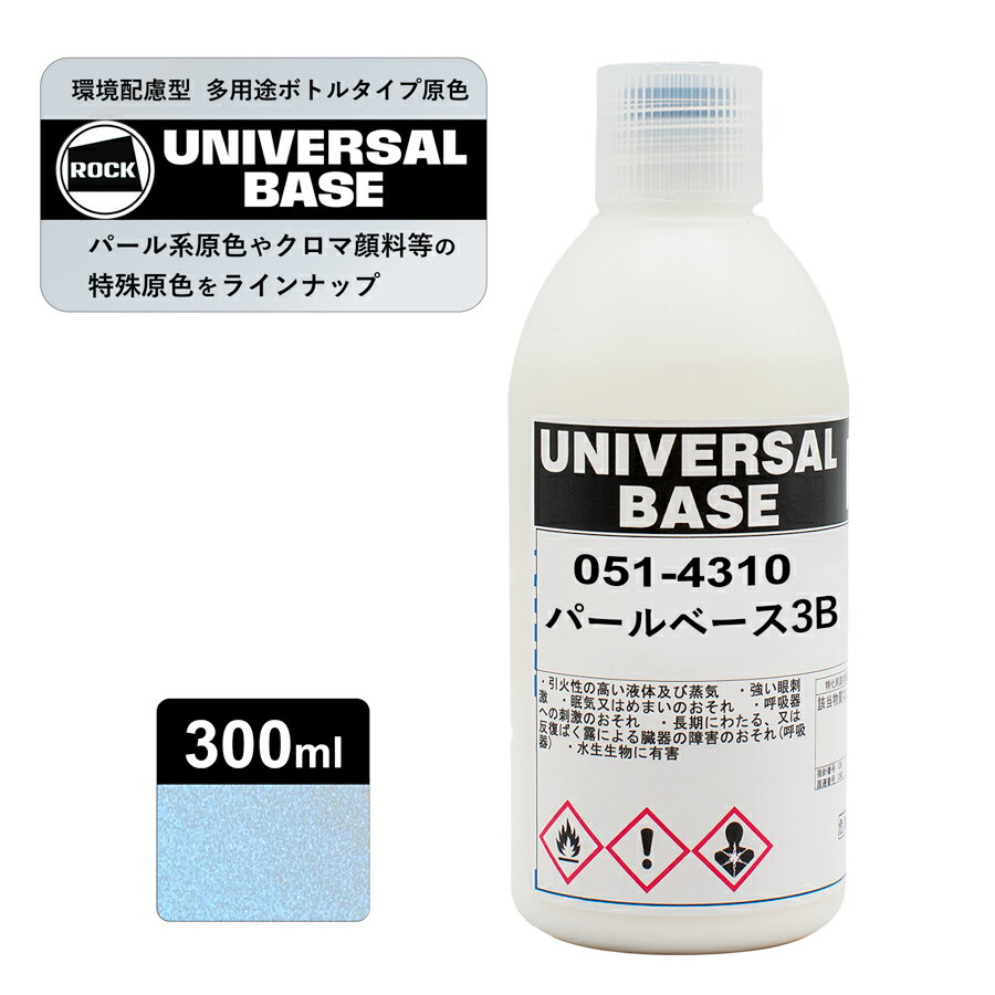 ROCKPAINT UNIVERSAL BASE 51-4363 300ML・自動車塗装、補修用・労働安全衛生法(特化則)に対応、PRTR届出不要の環境配慮型塗料です。(2021年9月現在) ・真珠光沢を持つパール顔料特有の光沢や色あいにより、深みのある独特な仕上がりを実現しました。 ・専用設計の300ml(クロマの他一部 100ml)樹脂容器を採用し、使いやすさを追求しました。 配合可能塗料 ロックペイント車両用塗料(077L プロタッチ、088L パナロック、073L ハイロック、079L ロックエース) 他、細かい仕様についてはロックペイントホームページをご覧ください