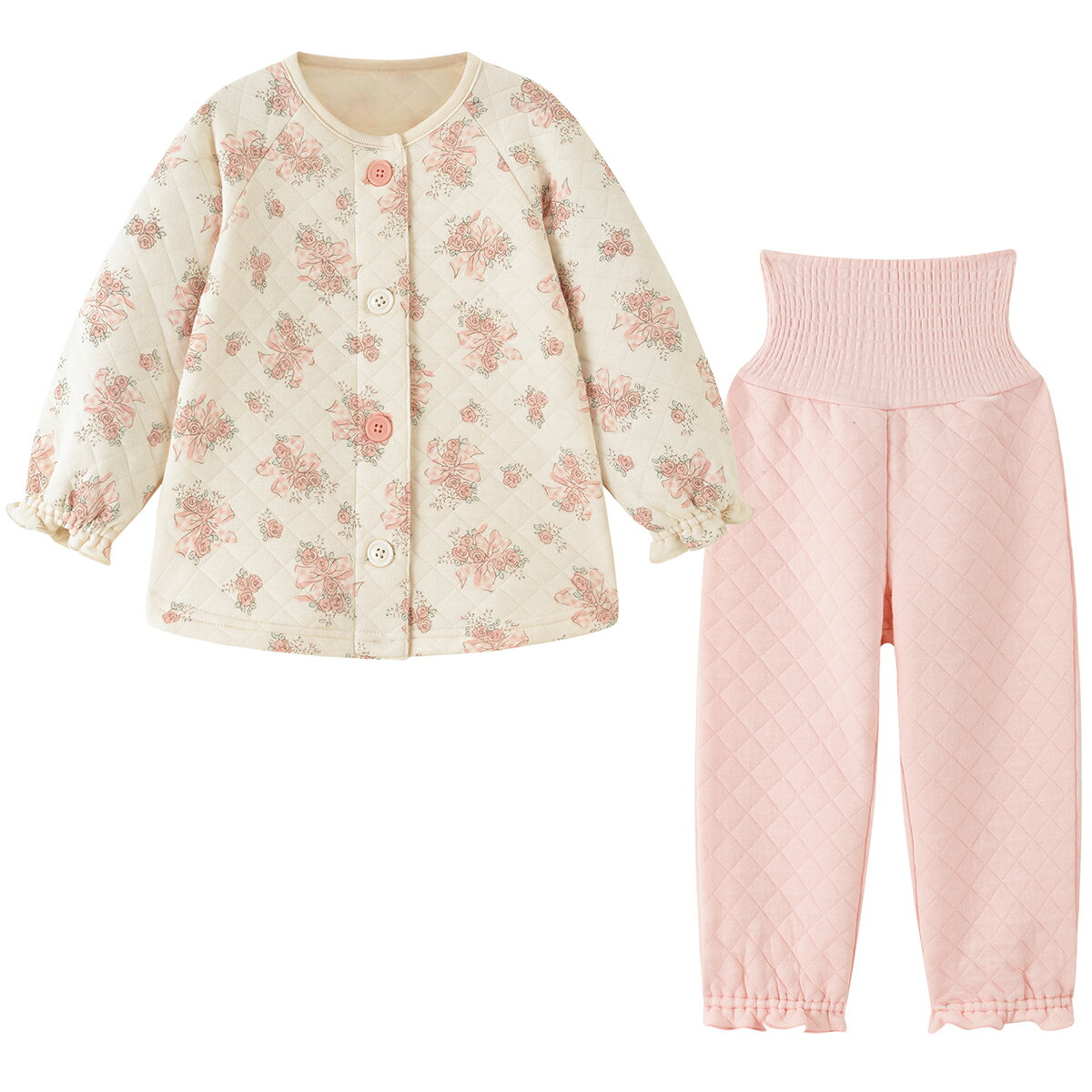 サイズについて 80トップス身幅29/トップス着丈38.1/トップス裄丈37.5/パンツヒップ幅31.2cm/パンツ総丈46cm/パンツ股下24cm90トップス身幅31/トップス着丈40.1/トップス裄丈41.5/パンツヒップ幅31.2cm/パンツ総丈53cm/パンツ股下30cm100トップス身幅33/トップス着丈43.1/トップス裄丈46/パンツヒップ幅33.2cm/パンツ総丈59cm/パンツ股下36cm110トップス身幅35/トップス着丈46.1/トップス裄丈51/パンツヒップ幅35.2cm/パンツ総丈66cm/パンツ股下42cm120トップス身幅37/トップス着丈49.1/トップス裄丈56/パンツヒップ幅37.2cm/パンツ総丈72cm/パンツ股下48cm130トップス身幅39/トップス着丈52.1/トップス裄丈61/パンツヒップ幅39.2cm/パンツ総丈79cm/パンツ股下54cm140トップス身幅41/トップス着丈55.1/トップス裄丈66/パンツヒップ幅41.2cm/パンツ総丈85cm/パンツ股下60cmのびのび腹巻付きあったかキルト長袖前開きパジャマ(花りぼん) 【素材】やわらかで軽くあたたかいニットキルト素材のパジャマ。肌に触れるキルトの両面は綿100%で肌触りよく、間にふんわりした中綿をはさんであたたかさをキープ。 【柄】ピンクのギンガムチェックリボンを結んだブーケをイメージした上品で可愛らしい総柄。 【仕様】パンツはのびのび腹巻つきで、寝ている間もおなかをすっぽりカバー。袖口と裾ギャザーの裏にはゴムが直接肌に当たらない工夫がされています。また、かけ違いを防ぐ配色ボタン&ホール仕様に加え、ボタンホールを斜めにしてボタンをとめやすくしました。 【備考】110〜140サイズはボタン5個、BACKマーク(ボトムのみ) 【ポケット】なし 【伸縮性】あり 【透け感】透けない 【クリーニング】洗濯機洗い可。ウエストリブの形状を保つため、洗濯後は形を整えて平干しを推奨。 【裏地】なし モニター・環境等により実際の商品と色味が多少異なって表示される場合がございます。 また、生産時期により色味が若干異なる場合がございます。予めご了承ください。 素材綿74%ポリエステル26%(ニットキルト)、ウエストリブ/綿95%ポリエステル5% 備考【備考】110〜140サイズはボタン5個、BACKマーク(ボトムのみ) カラー展開アイボリー サイズ展開80、90、100、110、120、130、140 ⇒ギフトラッピングをご希望の方