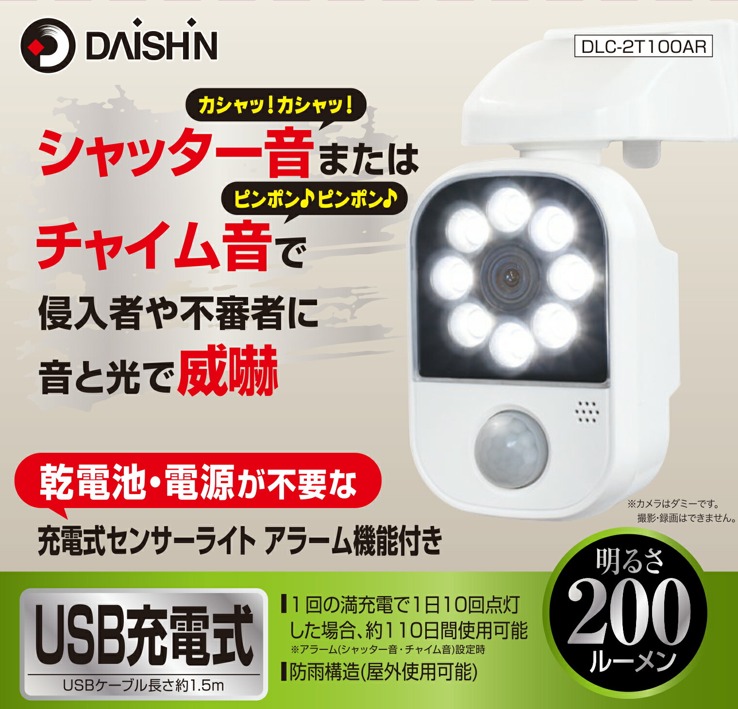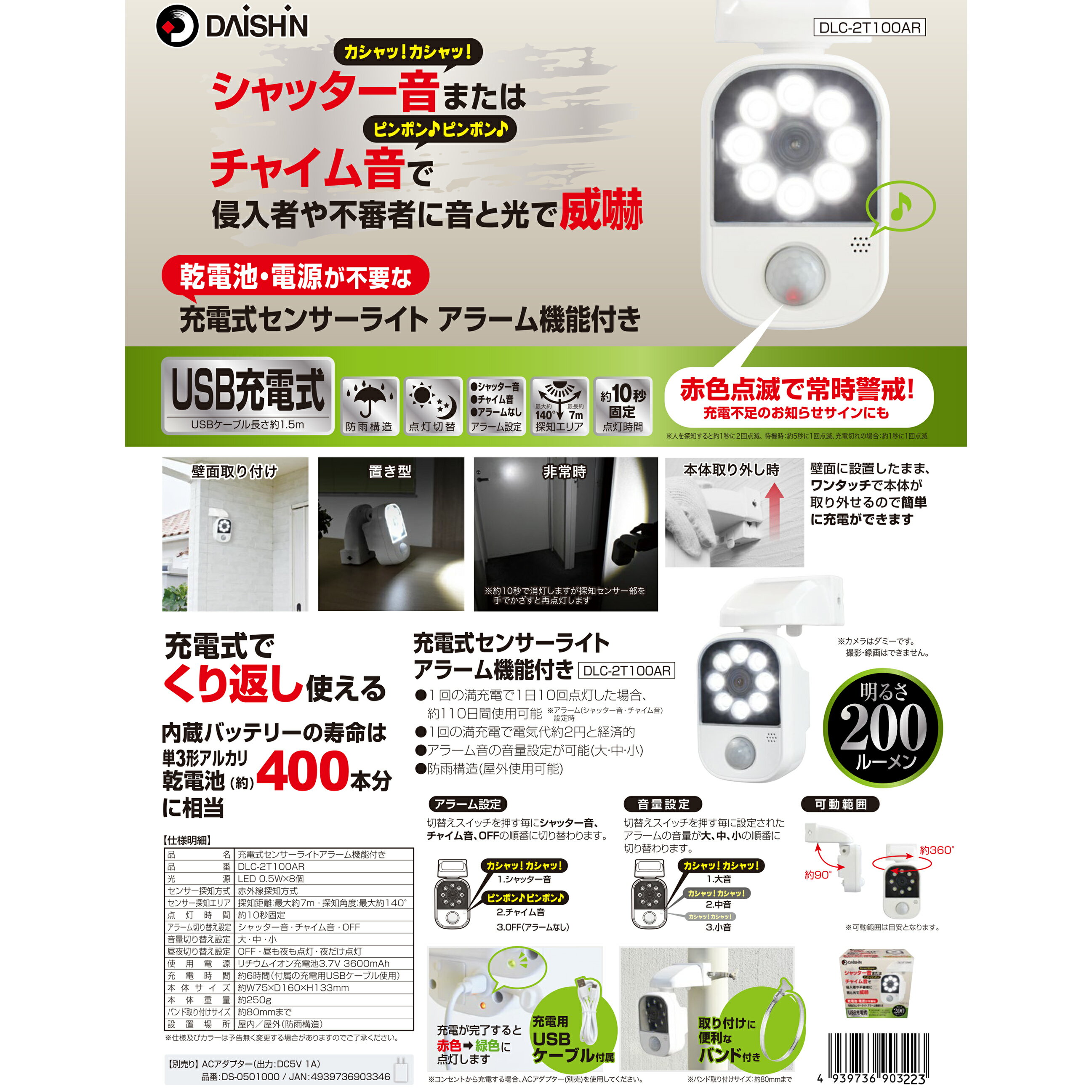 大進 センサーライト 人感センサー usb充電 アラーム機能付き DLC-2T100AR センサーライト 外灯 USB 人感 ledセンサーライト 屋外 用 屋内 防犯ライト 防犯 屋外 取付バンド 人感センサーライト 屋外 防犯 ライト 玄関灯 1年保証 節電 防水 規格 防雨型 屋外用センサーライト