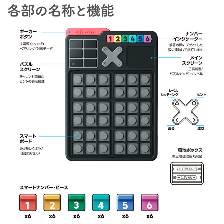 ※ギフト対応アイコンについて GiiKER(ギーカー)スマートナンプレ パズル です。 スマートナンプレは、数字のパズル(ナンプレ)をデジタル制御したゲーム機です。 自動タイムカウントやヒント機能、2台をBluetoothで繋いで人間vs人間の対戦モードを可能にしています。 パズルスクリーンに表示されるチャレンジをセットしたら、全てのスマートナンバー・ピースを各列/行/エリアに数字が被らないように配置するナンプレ=数字のパズルゲームです。 レベルアップ式チャレンジ問題は2500問あります。 これまでにないデジタル制御された数字のパズルをお楽しみください。 ※取扱いについて スーパーナンプレは、電子機器となるため、落下や水没などほかの電子機器と同じように、故障の原因となるため、取扱いにはご注意ください。 ※保証について 購入日から90日間が保証期間となります。 保証期間内において、通常の使用状態で製品の欠陥が発見された場合は、当店から正規代理店のキャストジャパンへ連絡し、対応いたします。 通常使用以外による原因由来は保証対象外となります。 予めご了承ください。 ●パッケージサイズ 約15cm×22cm×6cm ●ボードサイズ 約14cm×20cm×3cm ●内容 ボード、ピース36個、プラスチックカバー1個、パズルエリア変更カバー1個、取扱説明書(日本語) ●電池 1.5V 単三電池単3電池×2本(別途ご用意ください) ●対象年齢 4歳〜 ●プレイ人数 1-2人 ●CE ヨーロッパ安全規格、おもちゃ安全基準「EN71」適合品お子様がなめても安全な塗料を使用しています。 CASTJAPAN/キャストジャパン/きゃすとじゃぱん/3歳/3才/三歳/三才/4歳/4才/四才/四歳/5歳/5才/五歳/五才/6歳以上/6才以上/六歳以上/六才以上/大人向け/大人も楽しめる/家族で遊べる/知育玩具/パズル/puzzle/ボードゲーム/STEM教育/ステム教育/理系/プログラミング/アナログプログラミング/認知症予防/アナログゲーム/カードゲーム/テーブルゲーム/誕生日/クリスマス/xmas/サンタクロース/サンタさん/送料無料/御祝/お祝い/プレゼント/ギフト/贈り物/みんなで楽しめる/ベビー/キッズ/幼児/乳児/男の子/女の子/孫/まご/Anbau/アンバウ/あんばう/ラッピング/ラッピング無料/無料包装/個別包装/熨斗/のし/メッセージカード/あす楽/入園祝い/入学祝い/おうち時間