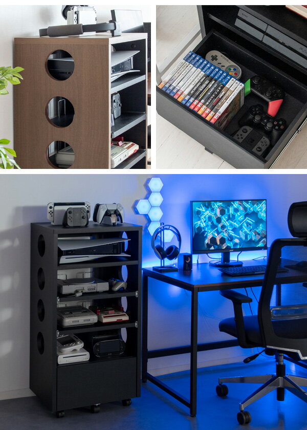 ゲーム機やコントローラー、ソフトや周辺機器をまとめて収納できる便利なデザイナーズゲームラック『REGABO(レガボ)』。 PS5など据置型ゲーム機が収納できる棚は真ん中2段がスライド引き出しになっておりレトロゲームのソフトのセットもラクラク。ヘッドフォンやSwitchなど携帯ゲーム機が置ける天板やゲームソフトやコントローラーが入る引き出し付きで収納力バツグン。キャスター付きで移動もラクラク。 お部屋に馴染むスマートなデザインのラックでごちゃつきなゲーム機器をまとめて収納することで、おしゃれな空間を演出します。サイドと背面オープン仕様で放熱対策も万全。カラーはブラウン×ブラック、ブラックの2カラーからお選びいただけます。 商品名デザイナーズゲームラック REGABO(レガボ) サイズ幅49×奥行き38×高さ99.6cm 材質合成樹脂化粧合板 耐荷重天板:15kg、上棚:10kg、スライド板:5kg、下棚:10kg、引き出し:4kg 備考組立品(約30分) ※基本送料無料(沖縄県・北海道・一部地域・離島等の条件によりましては別途送料が必要となります。) 関連商品 オープンタイプ【PS5縦置】オープンタイプ【PS5横置】 ガラス扉ガラス扉【引出し付】 コンパクト収納ラックゲーム収納ラック 検索ワード プレゼント クリスマス 誕生日 人気 おすすめ おしゃれ ランキング インスタ映え インスタ インスタグラム Instagram商品名デザイナーズゲームラック REGABO(レガボ) サイズ幅49×奥行き38×高さ99.6cm 材質合成樹脂化粧合板 耐荷重天板:15kg、上棚:10kg、スライド板:5kg、下棚:10kg、引き出し:4kg 備考組立品(約30分) 関連商品 オープンタイプ 【PS5縦置き】 【PS5横置き】 ガラス扉タイプ 【PS5対応】 【PS5対応 収納付き】 ラックタイプ 【Switch専用】 【PS5対応】