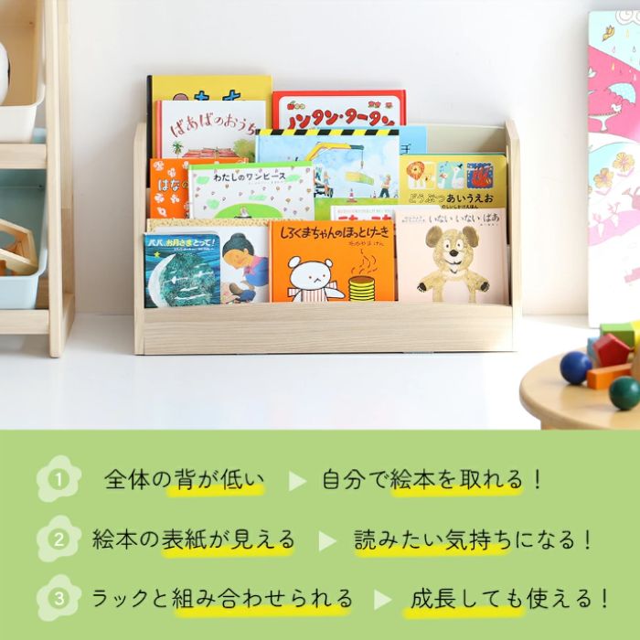 ●全体の背が低い → 自分で絵本をとれる ●絵本の表紙が見える → 読みたい気持ちになる ●ラックと組み合わせられる → 成長しても使える 約35cmの低い高さで設計された絵本ラックです。 小さな子どもが自分ひとりで簡単に絵本を取り出すことができます。 自分で絵本をとれるから、絵本時間がふえます。 収納部分はそれぞれ15cm、15.5cm、21.5cmの深さ。 また奥行きは各7cmあるので、絵本の大きさに合わせて収納できます。 手が届く高さなので、子どもも絵本を片づけることができます。 お片づけの習慣を身につけるのに役立ちます。 側板には取手の穴があります。商品重量が約7.1kgなので、 使う場所の移動や模様替えの際に大人の方が持ち運びやすい形状になっています。 丸みのある側板やキズ防止のフェルトが付いているなど、細部にもこだわっています。 商品サイズ:W 645 x D 275 x H 345 mm 商品重量:約7.1kg 材質:本体:プリント紙化粧繊維板 耐荷重:各本収納部/2.0kg, 組立仕様:組立品 ※基本送料無料(沖縄県・北海道・一部地域・離島等の条件によりましては別途送料が必要となります。) 検索ワード 男の子 女の子 1歳 1才 一歳 一才 2歳 2才 二歳 二才 3歳 3才 三歳 三才 4歳 4才 四歳 四才 5歳 5才 五歳 五才 幼児 乳児 小学生 頑丈 丈夫 Instagram インスタ映え クリスマス ベビー ベイビー Baby 兄弟 姉妹 子供 子ども こども 孫 従妹 いとこ 姪 甥 姪っ子 甥っ子 職場 先輩 後輩 同僚 友達 友人 親友 知り合い ママ友 人気 おすすめ おしゃれ ランキング インスタ映え インスタ インスタグラム Instagram