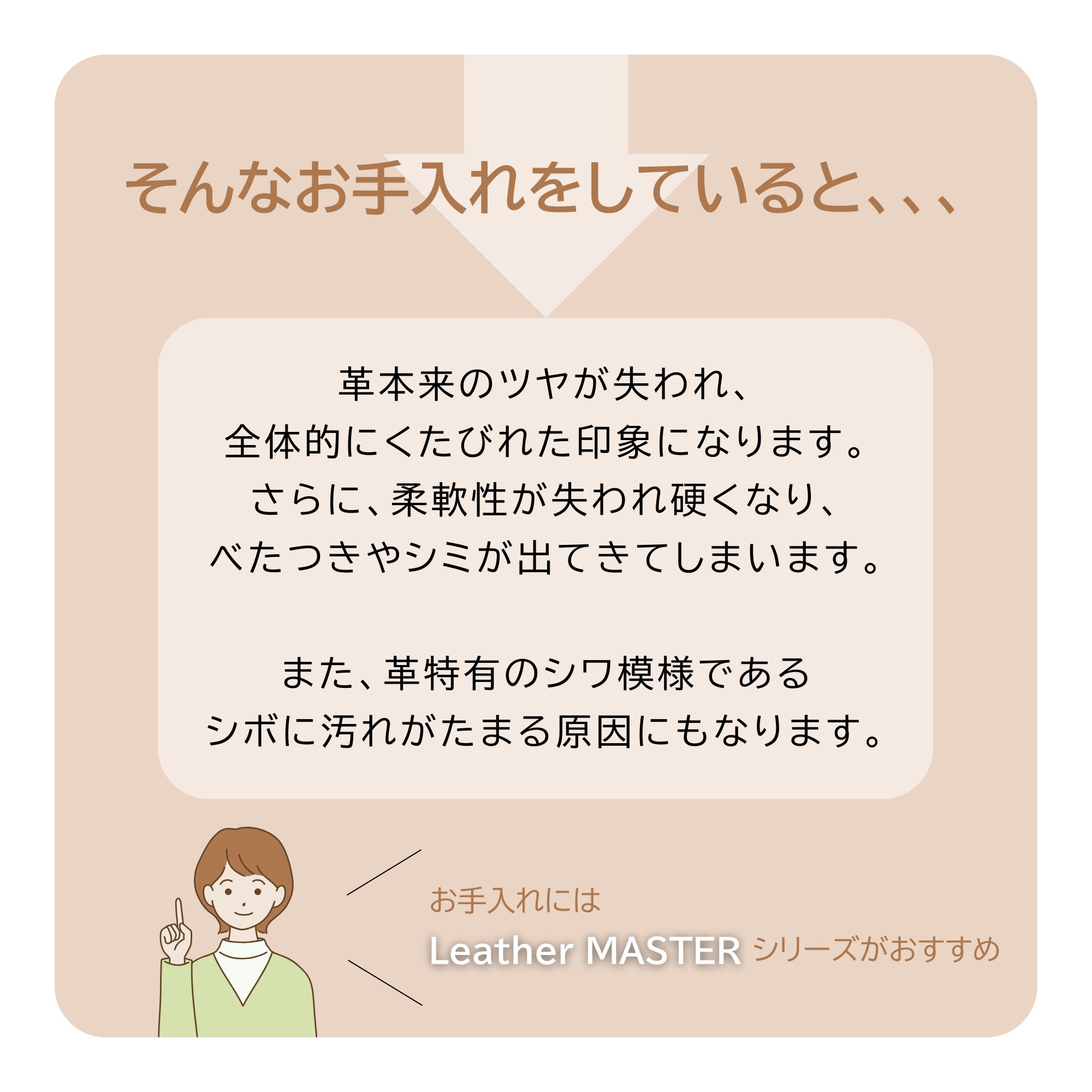 新品の革製品に、未来の安心をコーティング。 カリモク推奨、フッ素フリーのプロテクト習慣。 「レザーマスター レザープロテクションクリーム」で、美しさを永く。 -------------------------------------------------- ▼こんな方にオススメです ✅ 新しいソファやバッグを購入後すぐに保護したい ✅ 飲み物や食べこぼしのシミ・汚れを未然に防ぎたい ✅ 汗や皮脂によるハンドルの黒ずみや劣化が心配 ✅ 小さな子供やペットがいるので、安心なケア用品を使いたい ✅ キットの保護クリームだけを使い切ってしまった -------------------------------------------------- ▼汚れを寄せ付けない、3つの理由 1. 見えない保護膜で水・油をダブルブロック! 革の表面に強力な保護膜を形成。水性の汚れだけでなく、油性の汚れ、汗や皮脂の侵入もブロックします。さらに紫外線による色あせも防ぎ、新品のコンディションを維持します。 2. 内部に浸透して潤いを与え、ひび割れや劣化を防止 革に必要な栄養と水分が内部まで深く浸透。乾燥を防ぎ、革本来の柔軟性を保ちます。美しい経年変化(エイジング)を楽しみながら、永く製品を使っていくための基礎を作ります。 3. 人と環境に優しい「フッ素・アルコール・有機溶剤フリー」 刺激の強い溶剤を含まない水性タイプ。さらに、環境への影響が懸念されるフッ素化合物も不使用です。小さなお子様やペットのいるご家庭でも、安心してお使いいただけます。 -------------------------------------------------- 使用量の目安 総革張り肘掛け椅子で1回の使用量 30ml~ 総革張りソファーで1回の使用量 50ml~ ※革の種類や状態によって使用量は異なります。 -------------------------------------------------- ▼商品仕様 商品名: レザーマスター レザープロテクションクリーム 150ml 内容量: 150ml 特徴: 水性、フッ素フリー、撥水、撥油 原産国: 日本(開発:イタリア ユニタス社) 適用対象: 一般的な革製品(顔料仕上げ革)。ソファ、自動車シート、バッグ、靴、ジャケットなど。 使用不可: オイルレザー、プルアップレザー、スエードやヌバックなどの起毛素材、エナメル革 -------------------------------------------------- ※全国送料無料 ※お届けの際にチャイムを鳴らしてお知らせをする場合がございます。ご不都合のある方は事前にお問い合わせください。 汚れる前の「一手間」が、美しさを大きく左右します。 世界品質の保護クリームで、大切な革製品に輝きと安心を。 検索ワード LeatherMASTER 保護剤 栄養クリーム 油分補給 予防 傷隠し 傷が目立たない リペア 補修 革を育てる 艶出し もっちり パサつき 色落ち 色抜け 色むら 水ジミ 白化 白ボケ 自動車 車内 チェア ワークブーツ Made in Japan ユニタス
