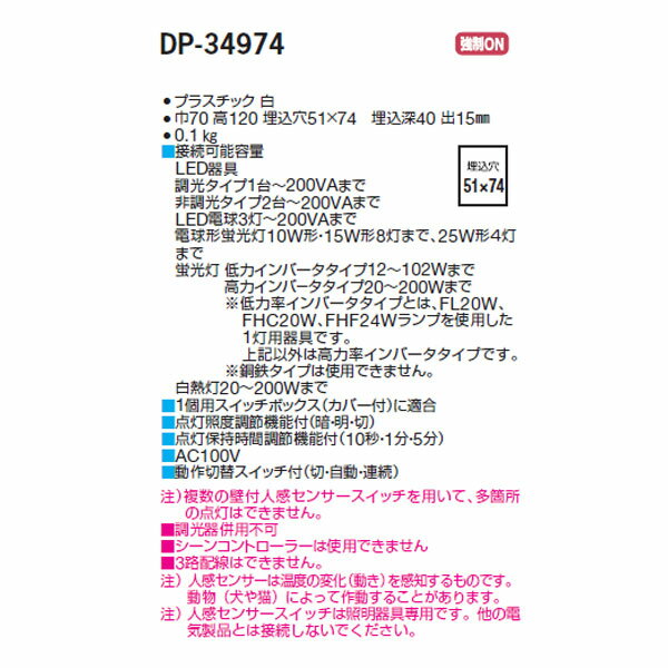 【DP-34974】 DAIKO 機能部品 壁付人感センサースイッチ ON/OFFタイプ 大光電機