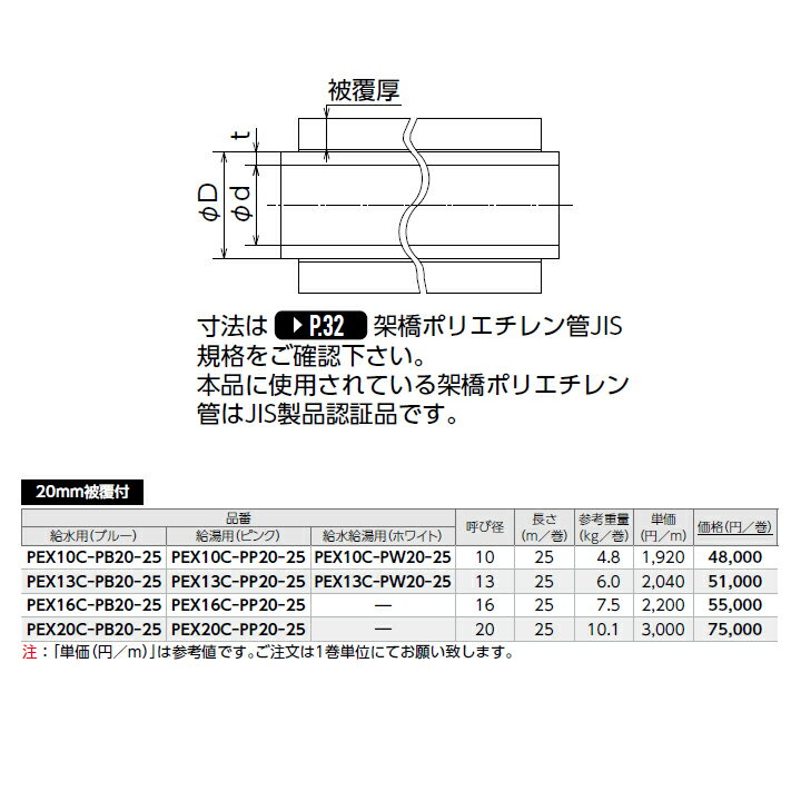 ●呼び径:20 ●長さ(m/巻):25 ●参考重量(kg/巻):10.1 ●呼び径16、20の5mm被覆付、10mm被覆付は被覆イージーカポリパイプW(低巻きぐせタイプ)に統合します。 ●従来と同じ単価(円/m)のままで、施工性が向上します。 ●被覆材の切除には、被覆カッターを使用して下さい。 ●市販のカッターナイフ等は使用しないで下さい。 ●樹脂管にキズを付けると漏水の原因になります。 ●カポリパイプWの被覆付です。 ◆商品型番 ・オンダ製作所 ・PEX20C-PB20-25 商品画像はイメージです。品番でのご注文となりますので、仕様やお色味などは事前にメーカーへご確認下さい。◆メーカー問合せ先 株式会社オンダ製作所【0575-24-8585】