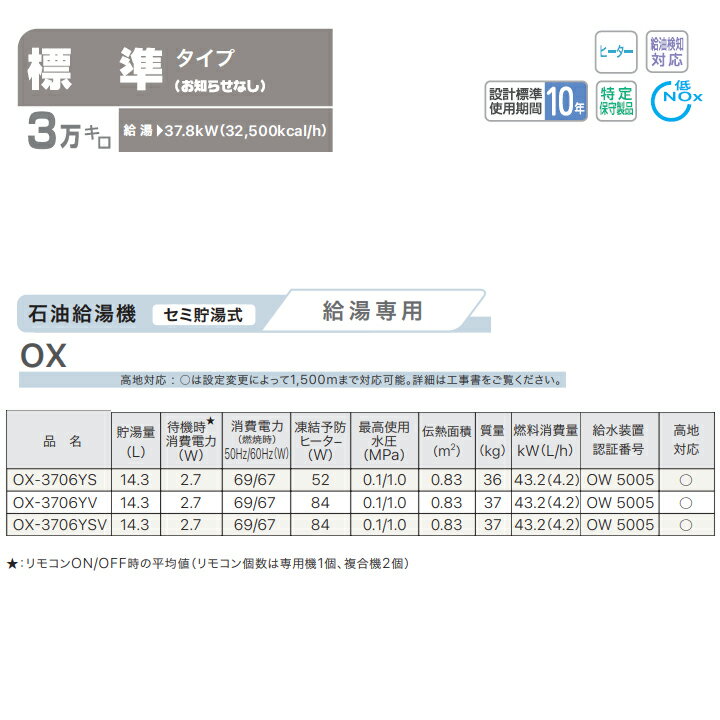【OX-3706YV】ノーリツ 給湯器 石油給湯機 給湯専用 セミ貯湯式 1階給湯専用 標準 3万キロ 屋外据置形 NORITZ