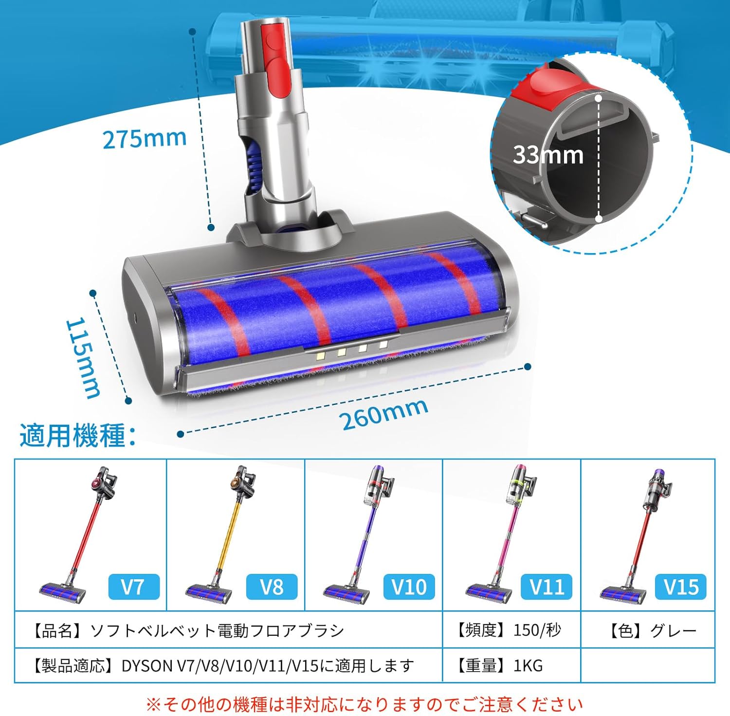 商品ポイント 【卓越な清掃性能】 ●このダイソン掃除機用のアタッチメントブラシは、優れた清掃性能を備えています。ブラシヘッドにはモーターが内蔵されており、ナイロンブラシが力強く回転して、奥深くに潜むほこりやごみを徹底的に取り除きます。また、特殊なカーボンファイバーブラシが静電気の発生を抑えながら、微細なごみやふんいきをも効果的に捕えます。花粉、髪の毛、カビ胞子、胚芽など、様々な種類の汚れを一掃し、清潔で快適な生活環境を提供します。 【幅広い適用機種】 ●ここのアタッチメントブラシは、ダイソンの V7、V8、V10、V11、V15 人気機種に対応しています。既にV7、V8、V10、V11、V15ダイソン掃除機をお持ちの方でも、すぐに使い始めることができます。このような幅広い適用機種により、多くの方に使っていただける便利なアクセサリーです。(上記以外の機種には対応していないため、ご購入前に必ずお使いの機種が適合するかを確認してください。) 【使いやすさと機動性&緑色 LED ライト】 ●ヘッド部分は、前後に 90°、左右に 180° 回転可能です。これにより、壁際や家具の隙間など、狭いスペースや隅々までも簡単にアクセスでき、徹底的な掃除が可能です。また、180° の超広範囲をカバーし、60cm の超長距離まで届く緑色 LED ライトを搭載しています。通常では目につきにくい微細なごみを明確に浮かび上がらせることができ、掃除のムダを省き、効率的に清掃することができます。 【簡単なメンテナンス&ブラシ水洗い可能】 ●このブラシのブラシパーツは簡単に取り外すことができます。取り外したブラシを水洗いすることで、日常的なメンテナンス作業をスムーズに行えます。また、このブラシは繰り返し使用可能で、長期的に使い続けることができるため、経済的でもあります。定期的なクリーニングが容易なこのデザインにより、常に清潔で衛生的な状態を保つことができます。 【多様な床材に対応】 ●木制床やタイル床など、様々な材質の床に対して理想的に適用できます。床の隙間や隅の奥深くに潜んでいる微細なほこりを効率的に吸い取ってくれます。また、このブラシは床材を傷つける心配がありません。柔らかいブラシ部分が床を保護しながら、強力な清掃性能を発揮するため、大切な床を汚れから守りながら、美しさを維持することができます。 【注意】 ※商品写真はできる限り実物の色に近づけるよう加工しておりますが、お客様のお使いのモニター設定、お部屋の照明等により実際の商品と色味が異なる場合がございます。 ※生産時期により、色、サイズ、デザイン、素材の質感が多少が異なる場合がございます。あらかじめ御了承下さいませ。 ※パッケージの箱に若干ダメージがある場合が御座いますが製品には問題ありません。 【品質保証】 弊社の商品は12ヶ月品質保証しています。万一が商品問題があればお問い合わせて弊社にメッセージに連絡お願いいたします。商品を交換?返金?返品ご対応してできます。製品は出荷前に安全作業性能を専門にテストします。ご安心してください。 ※ お客様ご自身の使用による破損や故障に関しましては保証対象外となります。 商品仕様 材質 ABS 総重量 約920g サイズ 約30.7 x 25.3 x 8.3 cm 配送について 一時欠品の際は、ご注文頂いて10-14日の入荷となります。 直接仕入先からの発送する場合があります。 メーカー完売の際はご容赦ください。 万が一出荷が遅れる場合はメールでご連絡致します。 メーカー希望小売価格はメーカーサイトに基づいて掲載しています