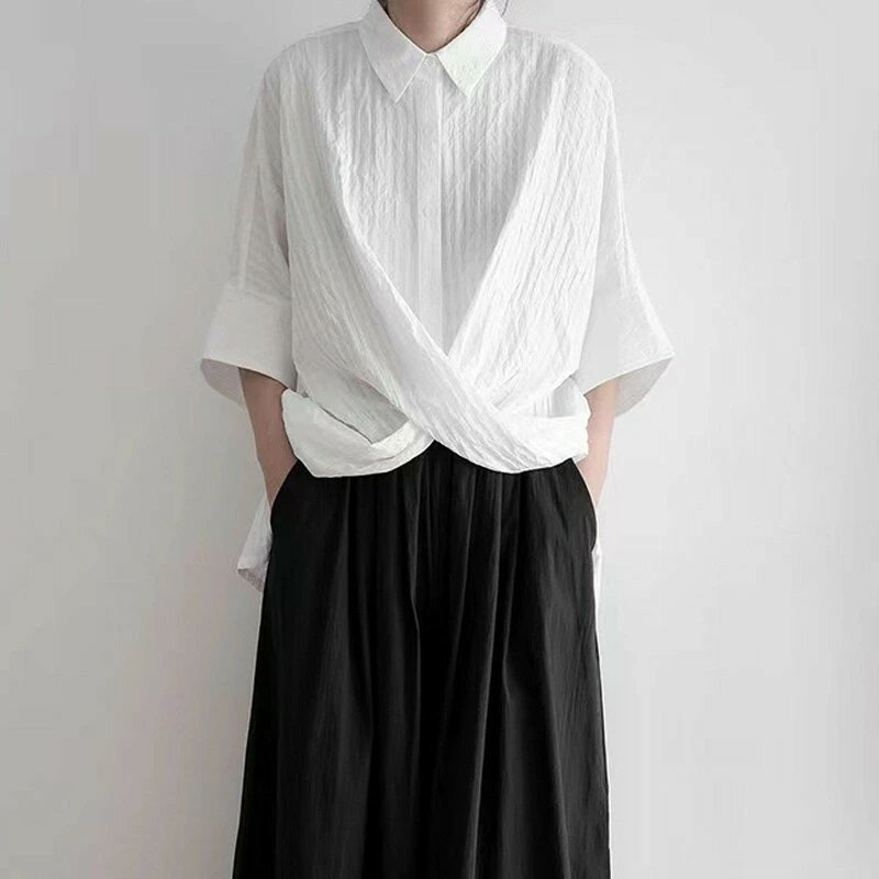ブラウス レディース 半袖 シャツ 襟付き 半袖シャツ トップス シャツブラウス 大きいサイズ カジュアル 裾クロス 白シャツ 綿混 前開き 折襟 無地 白 黒 ゆったり ベーシック 薄手 春 夏 大人 可愛い 送料無料