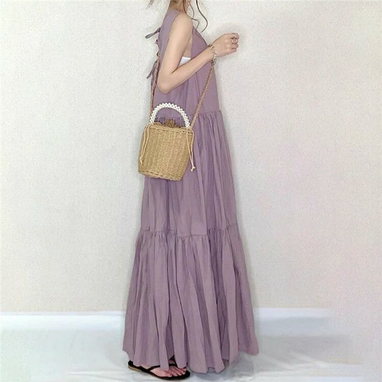 森ガール ワンピース 夏 レディース ロング丈ワンピース ティアード フリル フリーサイズ ゆったり 丸首 膝丈 パープル 可愛い オシャレ 30代40代50代 体型カバー ワンピース カジュアル 夏 背中 開き 後ろリボン 黒ワンピース 夏 送料無料