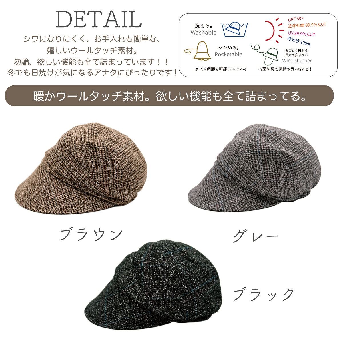 商品説明素材本体 ポリエステル90% 綿 10% 中地 ポリエステル100%(遮光) 裏地 レーヨン100% サイズ頭周り56~59cm クラウン高さ約16cm つば約9.5cmカラー ブラック/グレー/ブラウン※撮影時の光の影響、モニター環境によりweb上の写真の色味と実際の商品の色味が異なる場合がございます。商品の特徴 【たためる!】 折りシワがつきにくいので、たたんで持ち運びOK! 旅先など、ずっと帽子をかぶらないシーンでも活躍します♪ 【洗える!】 手洗い可能なので汗・化粧ヨゴレもこわくない! 【UPF50+!近赤外線99.9%CUT! UV99.9%CUT! 遮光性100%(つばのみ)】 紫外線からしっかり顔をガード! UPF50+!近赤外線99.9%CUT! UV99.9%CUT! 遮光性100%(つばのみ)!! 全部詰め込みました!! 【静電気のパチパチ対策も!!】 繊維の摩擦で起こる静電気の発生を抑制します! 【更に、吸湿発熱も!!】 裏地に吸湿発熱加工を施した生地を使用することで、寒い日もポカポカ!! 【小顔効果・スッピン隠しにも!】 つばが広く顔周りをカバー出来、 視覚的に小顔に見え、急なお出かけ時のスッピン隠しにも最適なアイテムです!注意点 ・こちらの商品はつばが平らな状態での発送となります。 ご使用される際につばをお好みの角度に曲げてご使用ください。 (つばで筒を作るように曲げていただくときれいなアーチになります) ・生地の取り位置により柄の出方・ニュアンスなど多少の個体差が生じ、画像と表情が異なることがございます。 ・生地の特性上、やや匂いが強く感じられるものもございます。 数日のご使用や陰干し、洗濯などで気になる匂いはほとんど感じられなくなるかと思います。予めご了承ください。 ・お取り扱いの前に品質ネームタグの記載をご確認下さいませ。 ・商品の品質ネームタグにカラー表記はございません。 ・糸の継ぎ目、ほつれ、などが生じている場合がございますが、品質上の問題はございません。 ・ 縫製技術などによるゆがみ・多少の糸が出ている、糸の始末(縫製時の切り残し)、染色剤の臭いがする等は商品不良には該当しません。 ・不良品以外の返品・交換は出来かねますので予めご了承願います。 【おすすめの季節】 メイン:春 秋 冬 【おすすめシーン】 運動会 山登り フェス レジャー 遊園地 バーベキュー(BBQ) ガーデニング ピクニック 遠足 出勤 旅行 散歩 海水浴 ウォーキング トレッキング ハイキング 釣り フィッシング などの マリンスポーツ。 ジョギング マラソン サイクリング 登山 BBQ バーベキューや キャンプ などの アウトドア フィットネス 。 マリンウェア スポーツウェア に合わせて。 野外での フェス ライブ 観戦 お買い物 ガーデニング 洗車時 ドライブ 通勤 通学 買い物のうっかり日焼け対策として。 【おすすめスタイル】 レディースファッション カジュアル エレガント アウトドア ママスタイル 【おすすめ用途】 自分用 プレゼント ギフト お祝い 誕生日 記念日 母の日 父の日 バレンタインデー ホワイトデー お返し クリスマス 敬老の日 結婚祝い 成人祝い 就職祝い 【機能性】 uv 日除け 紫外線 防寒 丈夫 耐久性 高機能 速乾 小顔効果 軽量 軽い 温かい 暖かい 被りやすい 快適 フィット ルーズ ゆったり ムレにくい 蒸れない 柔らかい 柔らかめ 深め 深い ウォッシャブル 洗える 洗濯可能 手洗い可能 【頭と顔の特徴】 丸顔 面長 大きい頭 頭大きい 小顔 初心者 【種類】 キャスケット ワークキャップ キャップ 【テイスト】 カジュアル シンプル ベーシック かっこいい かわいい おしゃれ お洒落 アメカジ スポーティー 【デザイン】 無地 コーデュロイ ツバ長い つば長い 折りたたみ可能 コンパクト 折りたたみ 折り畳み 薄手 厚手 【ターゲット】 レディース 女性 メンズ 男性 男女兼用 ユニセックス 【対象年齢】 大人用 10代 20代 30代 40代 50代 60代 □当店取り扱いアイテム・検索キーワード・機能・用途・おすすめのシーン 10代 20代 30代 40代 50代 60代 70代 80代 90代 女優帽 UVカット帽子 飛ばない 秋 冬 春 春 夏 UVカット 深い ニット帽 撥水 近赤外線 帽子汗止めテープ 汗止め 汗取り テープ パット シート 汗防止 汚れ防止 汗取りパッド ラフィア ラフィアハット ハットキーパー ひも ハットライナー キャスケット ハット キャップ サファリハット スヌード ダウン マフラー ネックウオーマー 防寒 小顔 帽子 メンズ帽子 ぼうし帽 ベレー帽 ベレー ベレー帽子 バスクベレー キャスケット ニット帽 ニット キャップ スウェット スエット ビーニー ワッチ 防寒帽 防寒帽子 ミセス ウィメンズ 婦人帽子 大人 お年寄り 高齢者 シニア 保育士 秋 秋用 秋物 冬 冬用 冬物 秋冬 秋冬物 秋冬用 秋用帽子 冬用帽子 秋冬帽子 秋帽子 冬帽子 秋の帽子 冬の帽子 温活 温活グッズ 保温 あったか あったかい あたたか あたたかい 温かい ふわふわ 暖かい ぬくぬく あったかグッズ 冷え予防 冷え対策 あったか帽子 あったかい帽子 シンプル オシャレ お洒落 可愛い かわいい カワイイ 無地 外出 外出用 室内帽 アウトドア 防寒 防寒用 防寒対策 寒さ対策