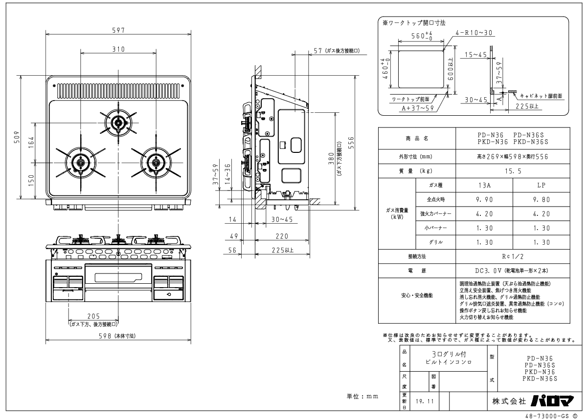 メーカー希望小売価格はメーカーカタログに基づいて掲載しています お手入れラクラクな無水片面焼グリルを搭載した、スタンダード・ガスコンロ。 天板は、バーナー周りのつなぎ目のないシールドトップ構造なので、お手入れも簡単です。 見やすい点火サイン、引き出しやすいグリル扉。 水無し片面焼グリル/両コンロ強火力/ 60cm幅ホーロートップ:ニュートラルグレー/シルバーフェイス 特長 New! 低荷重温度センサー(全コンロ)・・・軽量なべでもより安定します New! 火力切り替えお知らせ機能(全コンロ)・・・自動で火力が大きくなる時、電子音でお知らせします 両コンロ強火力・・左右で火力の強弱がないので、自由にコンロをお使いいただけます。 水なし片面焼グリル・・・水が要らないのでお手入れが簡単。カラッとこんがり焼きあげます。 ●コンロ機能・・・低荷重温度センサー(全コンロ)/高温炒め機能(右コンロ)/早切れ防止機能(左右コンロ) ●グリル機能・・・水なし片面焼グリル ●お手入れ性能・・・フラット構造/すっきりクリーンゴトク ●安心機能・・・火力切り替えお知らせ機能/立ち消え安全装置/調理油過熱防止装置/焦げつき消火機能/消し忘れ消火機能/グリル過熱防止機能/グリル排気口遮炎装置/異常過熱防止機能(コンロ)/操作ボタン戻し忘れ機能/ 仕様 メーカーパロマ 型番PKD-N36S トッププレート/カラー 60cm幅 ホーロートップ/シルバーフェイス 外形寸法 [mm]H269(本体220)×W598(天板597)×D556(天板奥行509) グリル庫内寸法 [mm]W209×D317×H(上段)61・(下段)76 本体質量 [kg]15.5 ガス接続/電源DC3.0V(乾電池単1×2) ガス消費量[13A Kw(kcal/h)][LPガス Kw(kg/h)][13A]全点火時9.90、左右コンロ4.20、奥コンロ1.30、グリル1.30[LPガス]全点火時9.80、左右コンロ4.20、奥コンロ1.30、グリル1.30 この商品について※この商品の設置には取り付け工事が必要です。