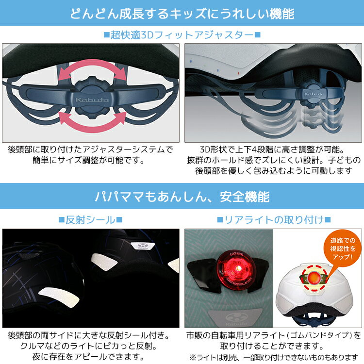 商品情報 きょうだいでお揃い!快適フィット&軽いヘルメット 商品名 aile エール M/Lサイズ 自転車用ヘルメット 小学生中学年〜高学年向け カラー Mサイズ: マットアイスブルー マットチャコール マットラテ マットフレアオレンジ マットグリッターパープル マットヘリンボーンミント スラッシュホワイト トライアングルブルー Lサイズ: マットアイスブルー マットチャコール マットラテ マットフレアオレンジ マットヘリンボーントリコ マットスペースブラック ドットホワイト サイズ Mサイズ:54〜56cm A:16〜19.5cm B:16cm C:15cm Lサイズ:56〜58cm A:16.5〜20cm B:16cm C:16cm 実計測値だけでなく、頭形により適合しない場合もございます。 重量 Mサイズ:250g Lサイズ:260g 生産国 中国 特徴 サイズ調整アジャスター付き 超快適3Dフィットアジャスター 後頭部に取り付けたアジャスターシステムで、簡単にサイズ調整が可能です。 3D形状で上下4段階に高さ調整が可能。抜群のホールド感 子どもの後頭部を優しく包み込むように可動します。 反射シール 後頭部の両サイドに大きな反射シール付き。クルマなどのライトにピカっと反射。 夜に存在をアピール! リアライトの取り付け 後部のエアホールを利用して、市販の自転車用リアライト(ゴムバンドタイプ)を取り付けることができます。 ※一部取り付けできないものもあります。 ※ライトは別途お買い求めください。 SGマーク認定 お手入れ インナーパッドは中性洗剤を薄めた水でやさしく手洗いしてください。 商品仕様について メーカーの製造時期・ロットにより商品の仕様やカラー等が予告なく変更された際、掲載画像と異なる場合があります。 仕様変更の理由による返品・交換はお受けしておりません。 ご不安な場合は事前にお問合せ下さい。■SGマーク認定■ OGK Kabuto 自転車用ヘルメット aile [ エール ] Mサイズ[54-56cm] / Lサイズ[56-58cm] 涼しくて軽いから、長時間かぶってもノンストレス OGK Kabutoの「軽くて涼しいヘルメット」 ブランドが培ったノウハウを活かし、 快適なフィッティングにこだわった「AILE(エール)」 すっきりフォルム&コンパクト形状、 お子さまのの後頭部を優しく包み込み、快適なフィット感を実現しています。※こんなシーンにオススメ:通園 / 通学 / 送迎 / 通勤 / 街乗り / おしゃれ ※