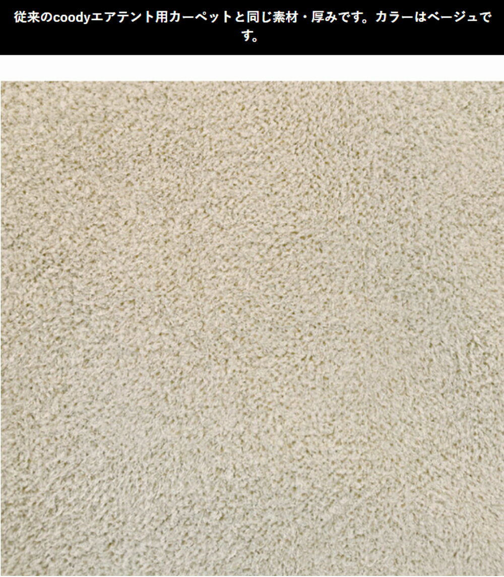 coodyカーペット(エアテント5.8専用) coodyカーペットは砕石の上でもふかふかの快適さをキープするように設計されています。 【製品特徴】 ・ 13mmの長い毛足で快適な居住空間を保てます。 ・丈夫な二重ロック加工でほつれにくく、長期間使用可能。 ・既存のcoodyエアテントカーペットと同じカラー・素材・厚みで仕上げました。 ・高品質な素材で作られています。 ・耐久性を強化し、長く快適に使えるよう設計されています。 ・ポール部分は丸みを持たせたデザインになっています。 ・底面には滑り止め加工がほどこされています。 ・テントの幅がフロアマットより広いため、テントにぴったり合わせるにはジッパー加工が必要です。 1.ノンジッパータイプ:テントより片側約35cm小さいサイズ。 2.ジッパータイプ:テントにぴったり合うサイズ。 ・KOTERI安全認証基準をクリアしています。 ※ご購入前に必ずご確認ください。 本製品は、ひとつひとつ丁寧に手作業で縫製されております。 そのため、以下の点についてあらかじめご了承いただいたうえでご購入くださいますようお願い申し上げます。 受注生産のため、ご注文後製作に2〜3日かかります。 【サイズについて】 ・±5cmの誤差は製品仕様の範囲内です。(手作業での縫製のため) ・カーペットはテントサイズより少し小さめに作られています。 ・ピッタリのサイズで作ると、端の撥水加工部分に水がたまるため、若干小さめの設計になっています。 【配送時の折りジワについて】 折りたたんで発送するため、到着時にシワがある場合がありますが、2〜3日で自然に伸びます。 洗濯後もシワは解消され、よりきれいにお使いいただけます。 【乾燥機は使用できません】 熱に弱い素材のため、乾燥機の使用はお控えください。 洗濯は中性洗剤を使用し、陰干しで自然乾燥させてください。 【サイズ・色について】 パソコン、携帯等、モニターの環境上、実際の商品の色とは多少違う場合がございます。