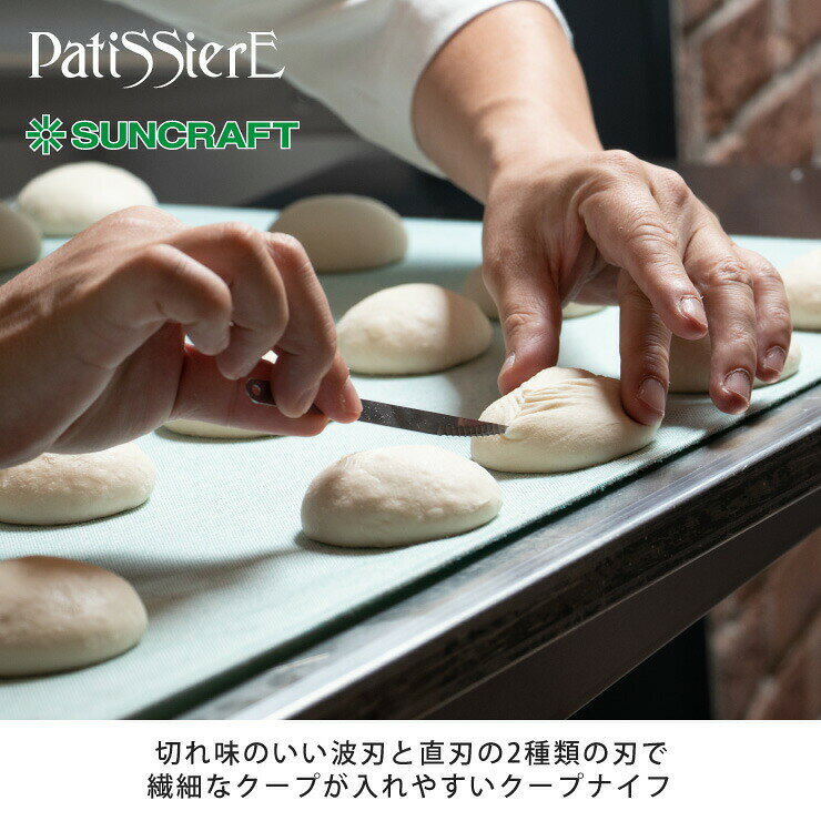 調理ツール商品切れ味のよい波刃と直刃でクープが入れやすい 刃物産地岐阜県関市で作られたクープナイフ 刃物産地、岐阜県関市で作られているので、その切れ味はお墨付き。 切れ味のよい波刃+直刃の2種類の刃で繊細なクープが入れやすいクープナイフ。 バケットやカンパーニュなどのパン作り、表面の飾り切りが見事なガレット・デ・ロアなど製パン、製菓の表現が広がるナイフです。 ○ カミソリ刃では難しい、具材入りの生地にもクープが入れられる 先端の直刃で、繊細な生地の表面を薄く切り込むことができます。波刃は従来のカミソリ刃では難しかった、シリアル(穀物)やドライフルーツ、ナッツが入った生地のクープ入れもできます。 ドイツパンは深くクープが入れられていて、生地とエッジがガサガサっと立ち上がるのが特徴なので、ドイツ系のパンを焼く際には重宝します。 ○ 切れ味のいい刃なので手早くクープが入る クープ入れは、パン窯やオーブン入れの直前に手早く行う工程。時間がかかってしまうと、せっかく状態の良い生地でも台無しになってしまいます。サンクラフトのクープナイフは刃物産地岐阜県関市の刃物づくりのノウハウが詰め込まれたナイフ。一度で素早くクープが入るので、窯入れ入れまでスムーズです。 ○ 直線的なクープに特に使いやすい ハンドルを少し下げることで、スライスの際に食材が手にあたることなくスライスできます。 全長を短くしても手の上までスライスする食材を引くことができるので、本体のコンパクト化が実現しました。 Patissiere(パティシエール) 伝統あるケーキ職人(パティシエ・パティシエール)直伝のノウハウが活かされた、プロ志向・本物志向の方におすすめの製菓用品シリーズです。ご家庭で本格的な手づくりケーキを楽しみたい方のために開発されました。 切れ味がよく、生地を傷めずにカットできるケーキナイフや高品質な国産の製造技術に裏打ちされた泡立てなど日本製の商品を多数取り揃えています。 品名 クープナイフ PP-801 サイズ 約8×130×0.5mm 重量 約3g 材質 ステンレス刃物鋼 シリーズ Patissiere 製造元 サンクラフト 生産国 日本